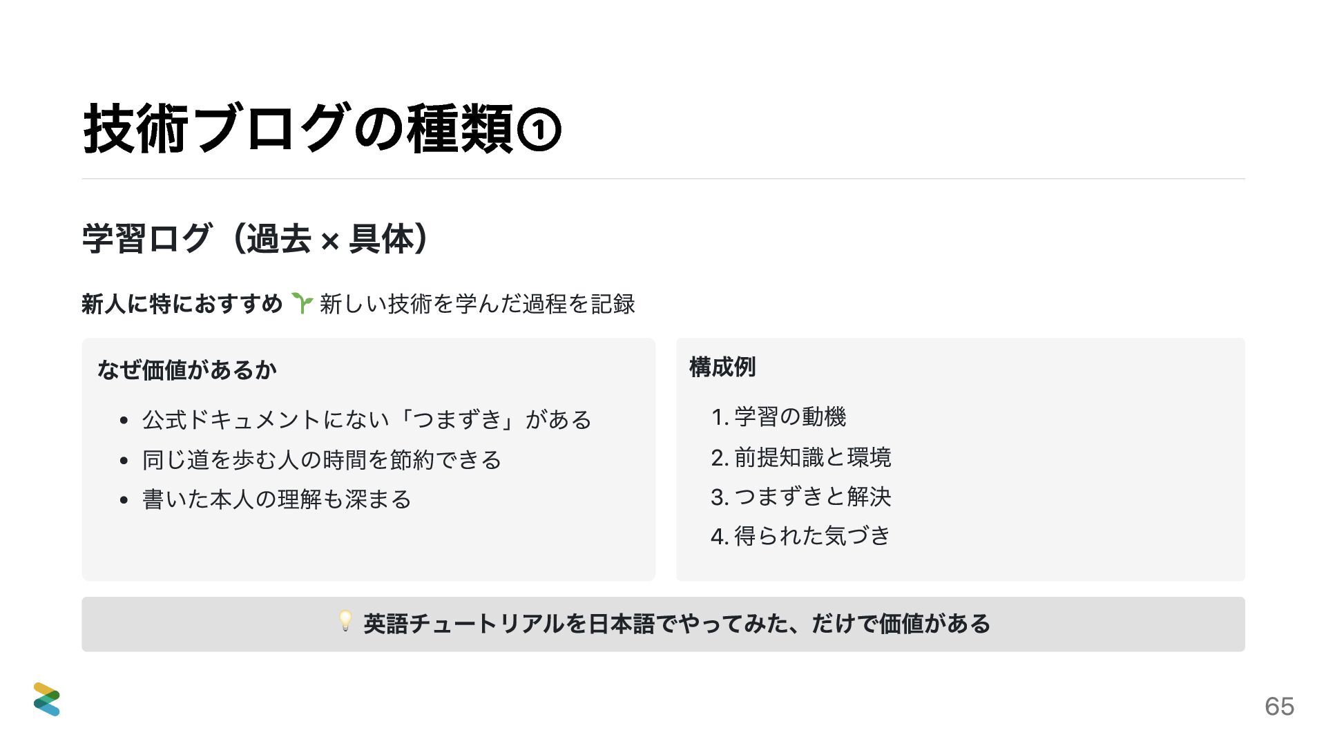 技術ブログの種類① 学習ログ(過去 × 具体) 新人に特におすすめ 新しい技術を学んだ過程を記録 なぜ価値があるか 公式ドキュメントにない「つまずき」がある 同じ道を歩む人の時間を節約できる 書いた本人の理解も深まる