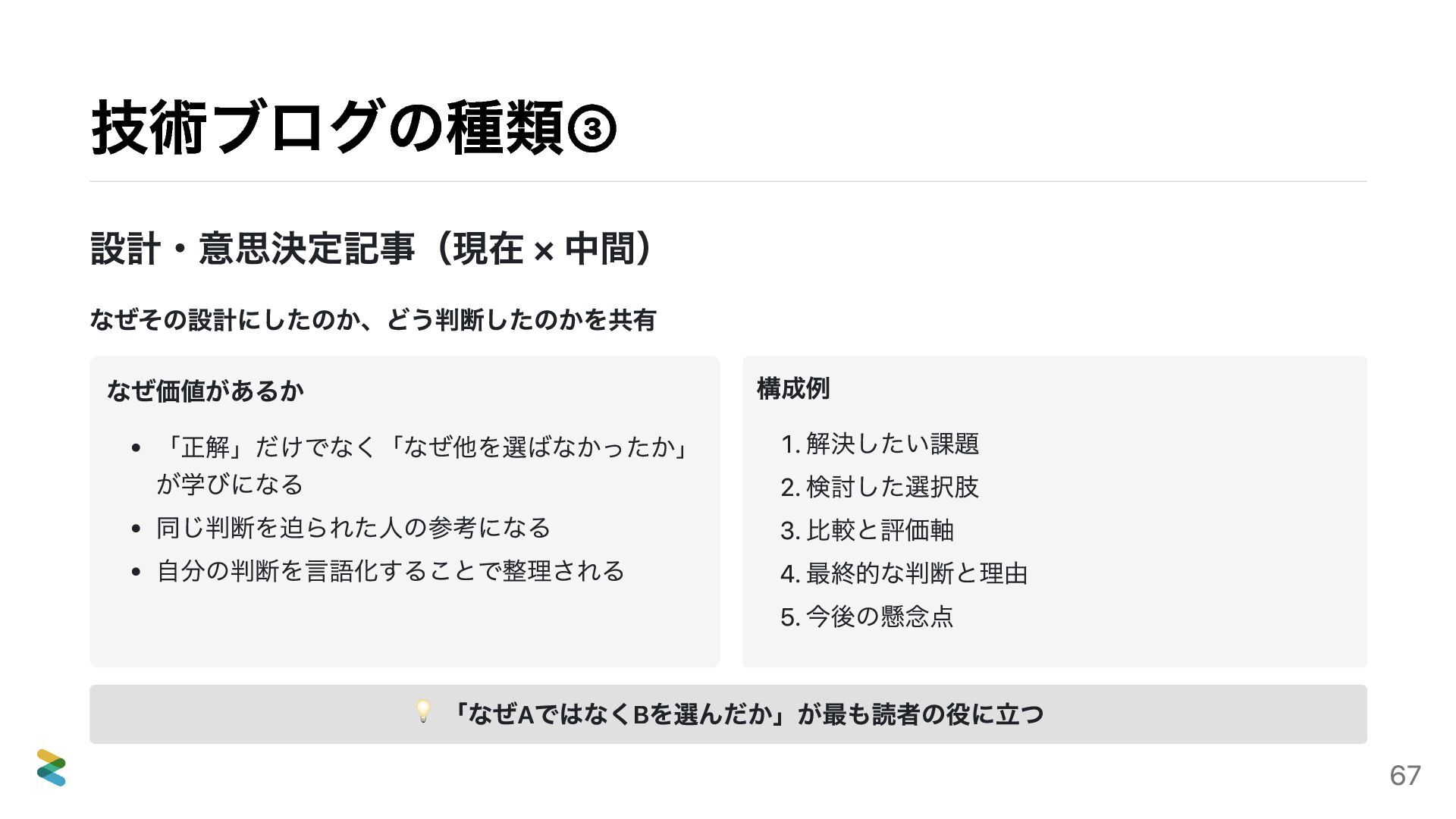 技術ブログの種類③ 設計・意思決定記事(現在 × 中間) なぜその設計にしたのか、どう判断したのかを共有 なぜ価値があるか 「正解」だけでなく「なぜ他を選ばなかったか」 が学びになる 同じ判断を迫られた人の参考になる 自分の判断を言語化することで整理される