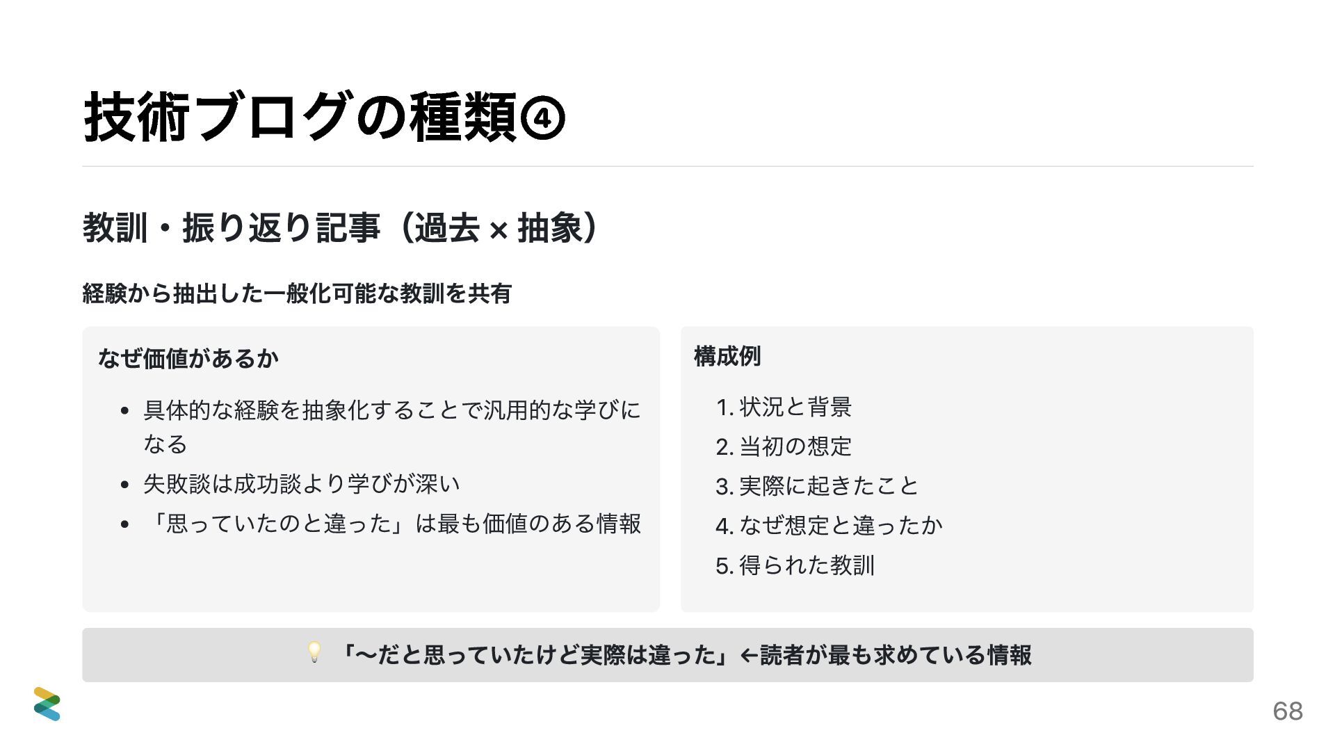 技術ブログの種類④ 教訓・振り返り記事(過去 × 抽象) 経験から抽出した一般化可能な教訓を共有 なぜ価値があるか 具体的な経験を抽象化することで汎用的な学びに なる 失敗談は成功談より学びが深い 「思っていたのと違った」は最も価値のある情報