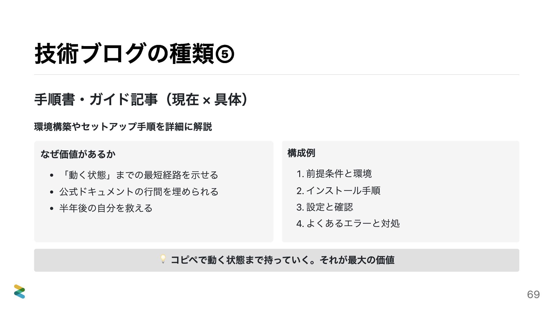 技術ブログの種類⑤ 手順書・ガイド記事(現在 × 具体) 環境構築やセットアップ手順を詳細に解説 なぜ価値があるか 「動く状態」までの最短経路を示せる 公式ドキュメントの行間を埋められる 半年後の自分を救える 構成例