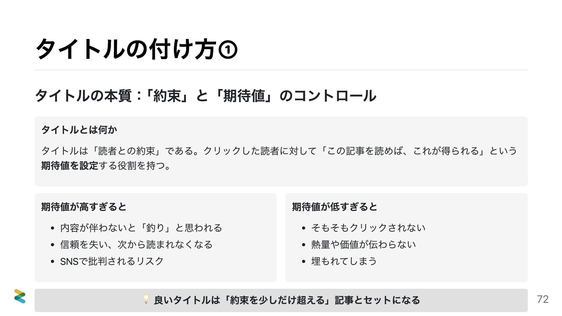 タイトルの付け方① タイトルの本質: 「約束」と「期待値」のコントロール タイトルとは何か タイトルは「読者との約束」である。クリックした読者に対して「この記事を読めば、これが得られる」という 期待値を設定する役割を持つ。 期待値が高すぎると 内容が伴わないと「釣り」と思われる 信頼を失い、次から読まれなくなる SNSで批判されるリスク
