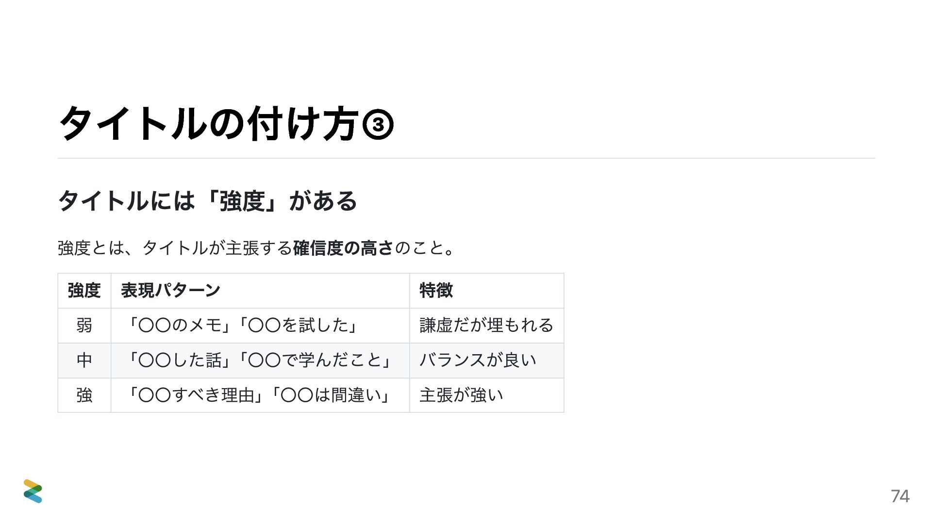 タイトルの付け方③ タイトルには「強度」がある 強度とは、タイトルが主張する確信度の高さのこと。 強度 表現パターン 特徴 弱 「〇〇のメモ」 「〇〇を試した」 謙虚だが埋もれる
