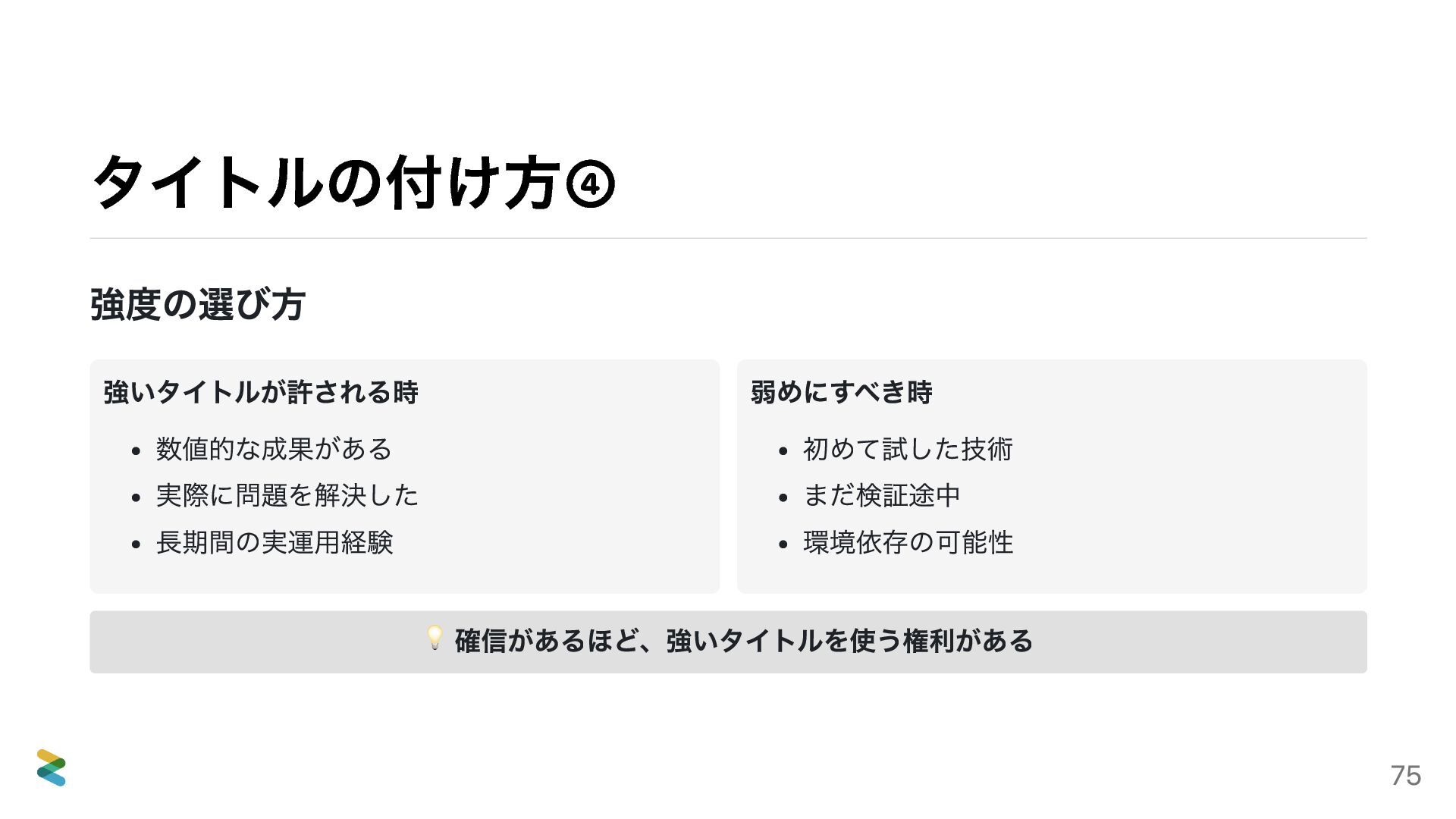タイトルの付け方④ 強度の選び方 強いタイトルが許される時 数値的な成果がある 実際に問題を解決した 長期間の実運用経験 弱めにすべき時 初めて試した技術 まだ検証途中 環境依存の可能性