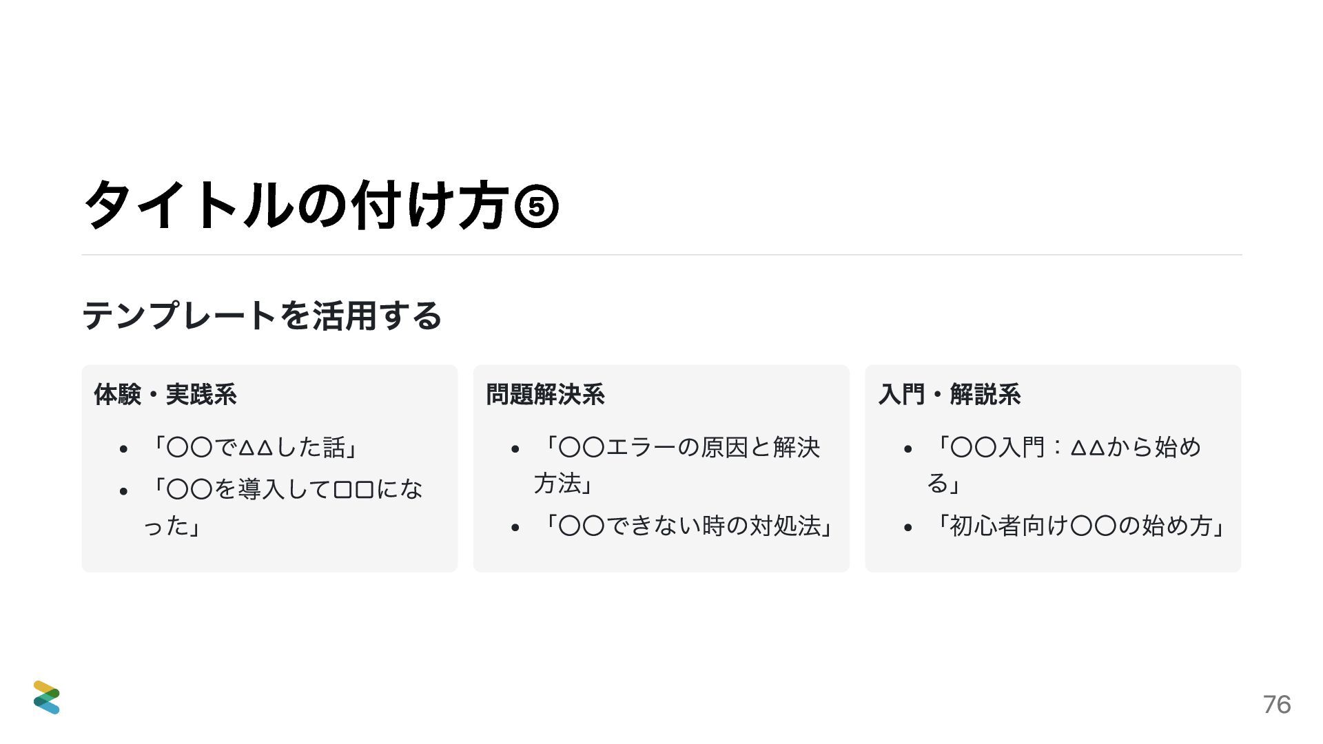 タイトルの付け方⑤ テンプレートを活用する 体験・実践系 「〇〇で△△した話」 「〇〇を導入して□□にな った」 問題解決系 「〇〇エラーの原因と解決 方法」 「〇〇できない時の対処法」