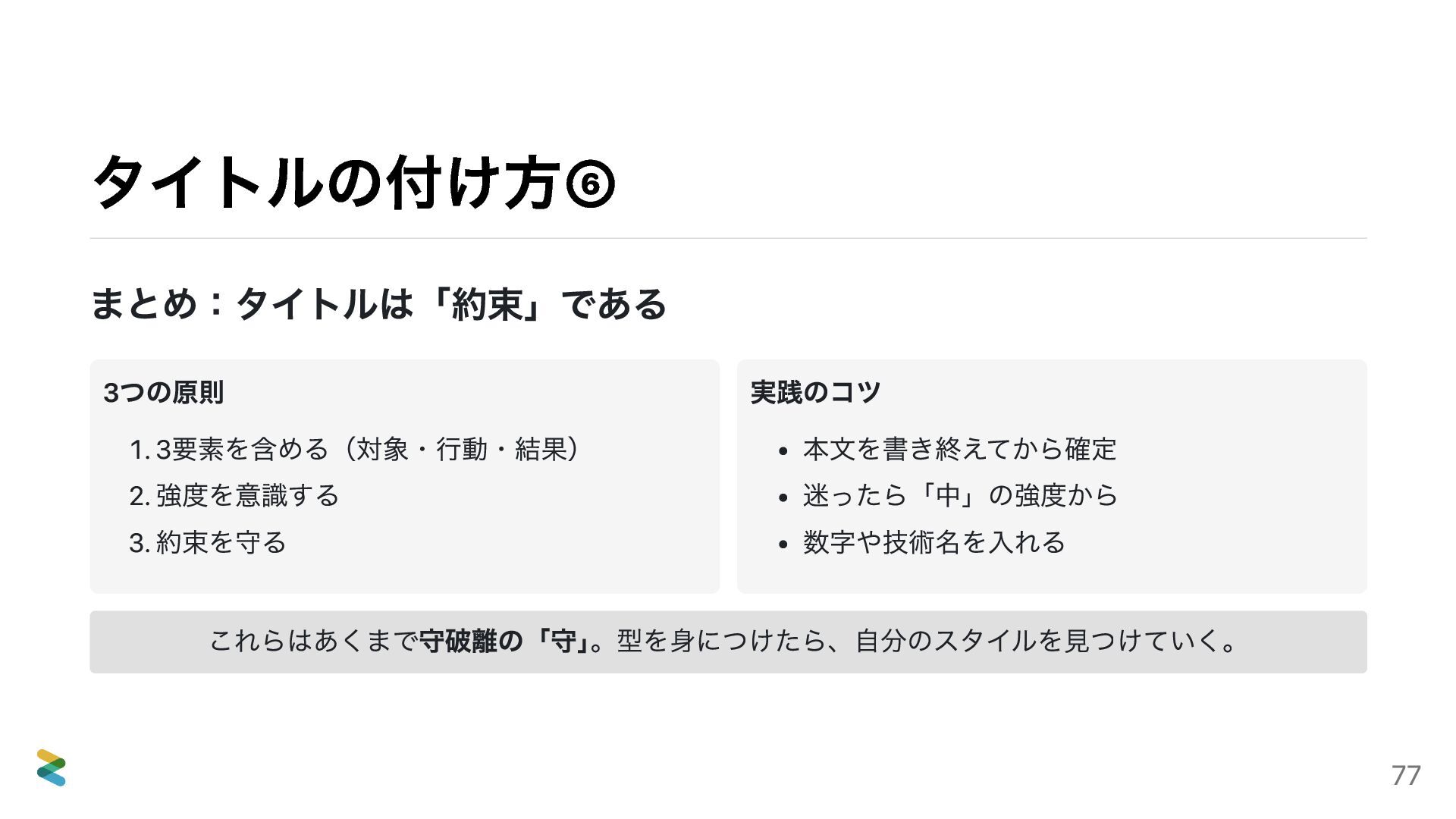 タイトルの付け方⑥ まとめ:タイトルは「約束」である 3つの原則 1. 3要素を含める(対象・行動・結果) 2. 強度を意識する 3. 約束を守る 実践のコツ