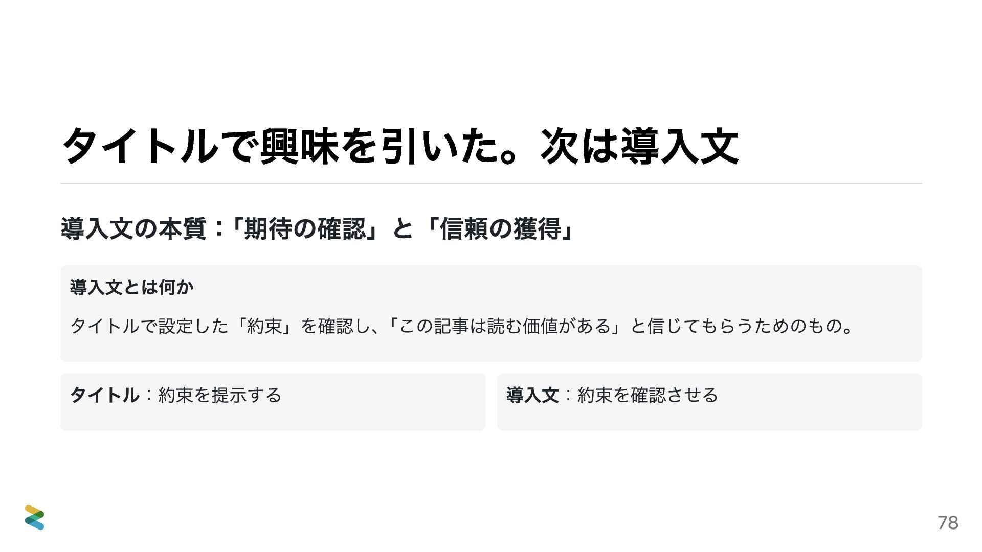タイトルで興味を引いた。次は導入文 導入文の本質: 「期待の確認」と「信頼の獲得」 導入文とは何か タイトルで設定した「約束」を確認し、 「この記事は読む価値がある」と信じてもらうためのもの。 タイトル:約束を提示する 導入文:約束を確認させる 80