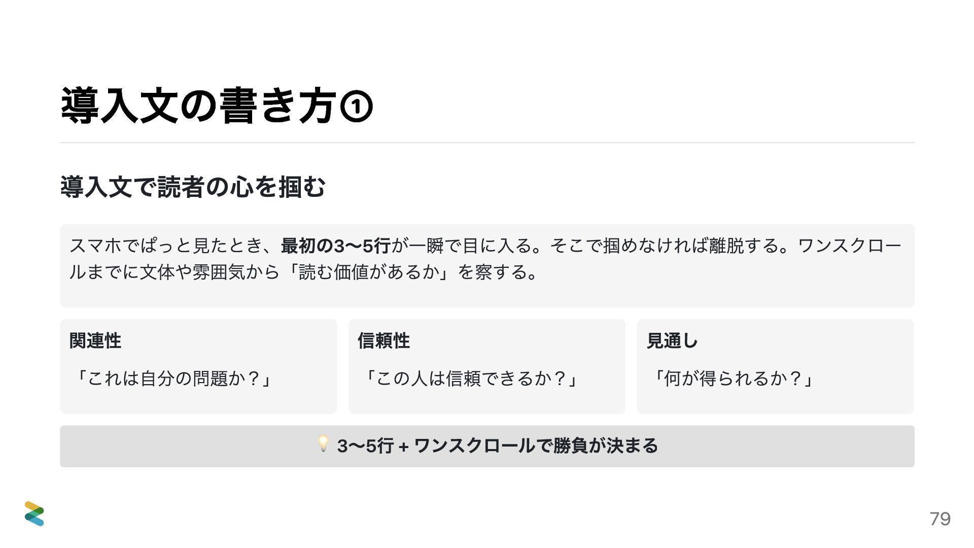 導入文の書き方① 導入文で読者の心を掴む スマホでぱっと見たとき、最初の3〜5行が一瞬で目に入る。そこで掴めなければ離脱する。ワンスクロー ルまでに文体や雰囲気から「読む価値があるか」を察する。 関連性 「これは自分の問題か?」 信頼性 「この人は信頼できるか?」 見通し 「何が得られるか?」