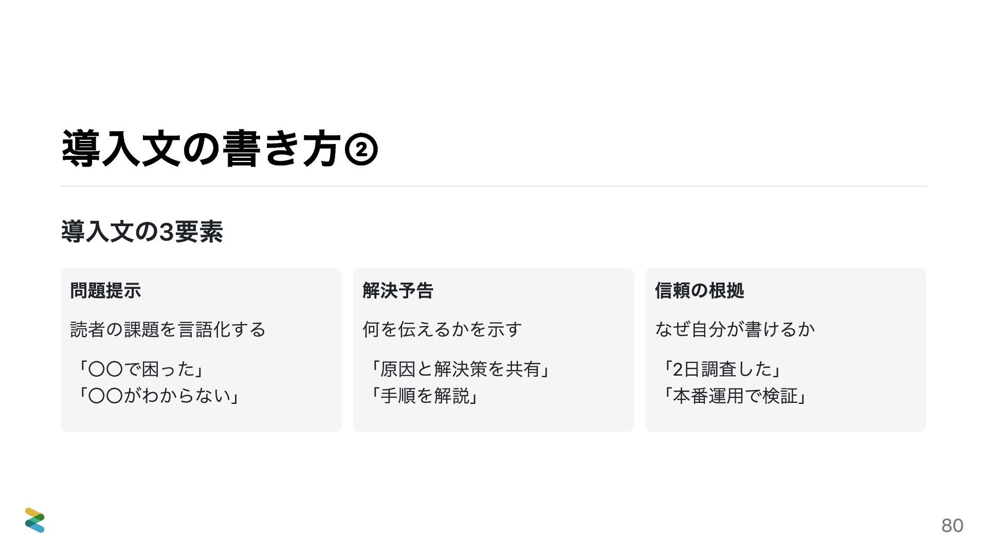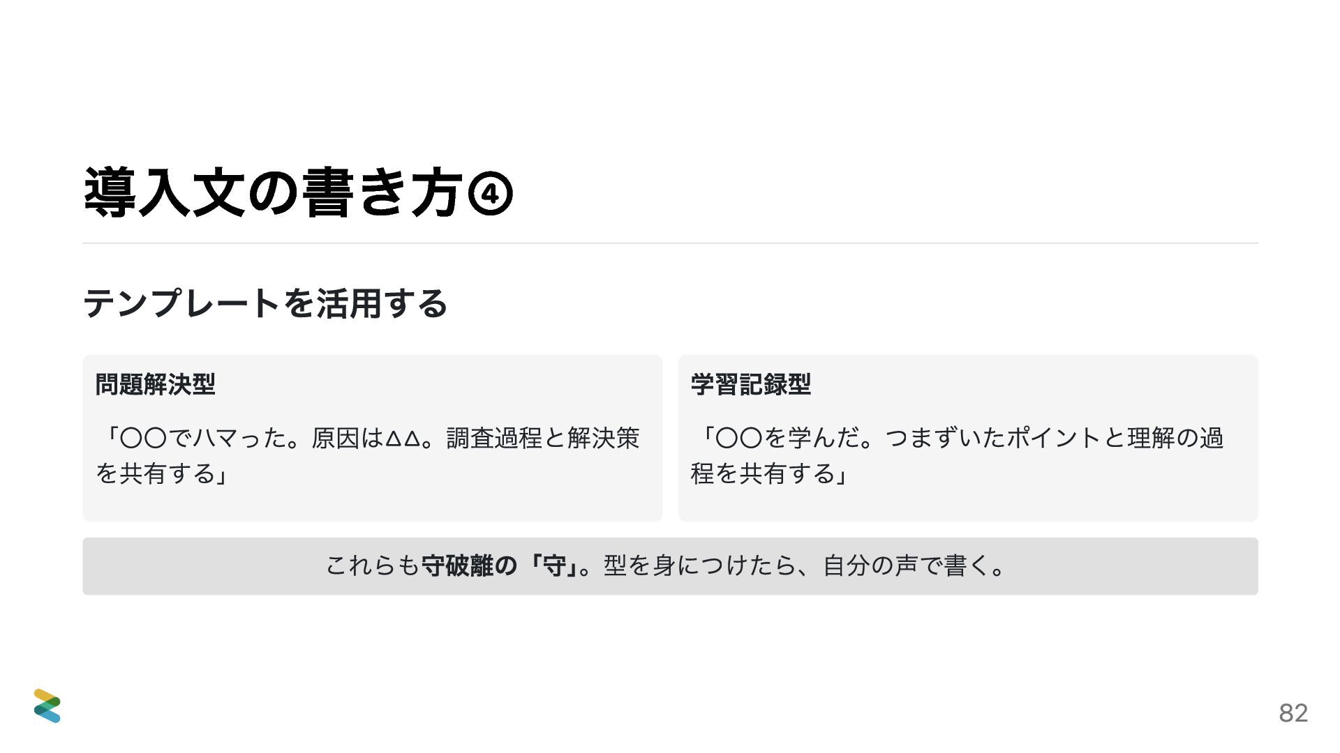 導入文の書き方④ テンプレートを活用する 問題解決型 「〇〇でハマった。原因は△△。調査過程と解決策 を共有する」 学習記録型 「〇〇を学んだ。つまずいたポイントと理解の過 程を共有する」 これらも守破離の「守」 。型を身につけたら、自分の声で書く。