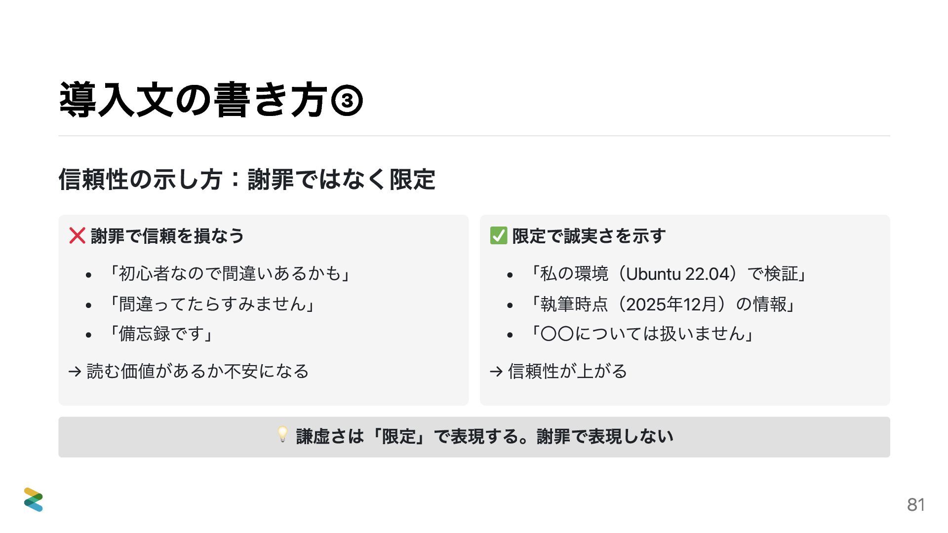 導入文の書き方③ 信頼性の示し方:謝罪ではなく限定 謝罪で信頼を損なう 「初心者なので間違いあるかも」 「間違ってたらすみません」 「備忘録です」 → 読む価値があるか不安になる 限定で誠実さを示す 「私の環境(Ubuntu