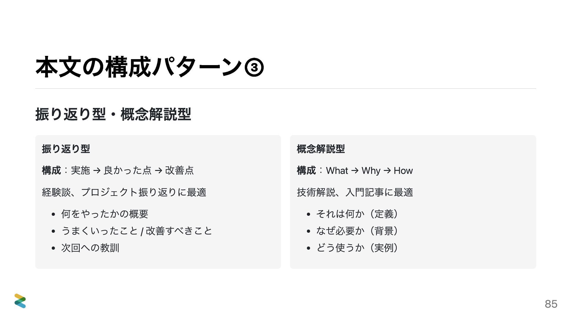 本文の構成パターン③ 振り返り型・概念解説型 振り返り型 構成:実施 → 良かった点 → 改善点 経験談、プロジェクト振り返りに最適 何をやったかの概要