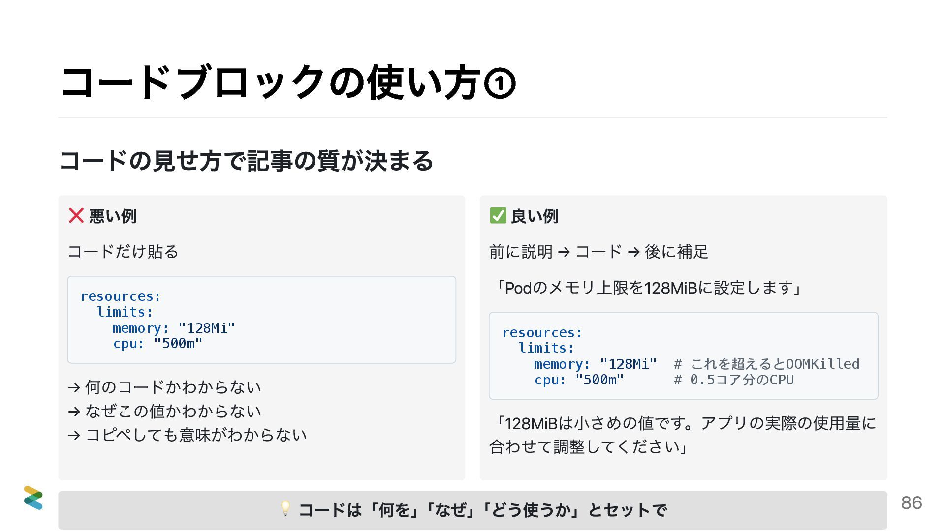 → 何のコードかわからない → なぜこの値かわからない → コピペしても意味がわからない 良い例 前に説明 → コード → 後に補足 「Podのメモリ上限を128MiBに設定します」 resources: limits: memory: "128Mi" # これを超えるとOOMKilled cpu: "500m" # 0.5コア分のCPU 「128MiBは小さめの値です。アプリの実際の使用量に 合わせて調整してください」 💡 コードは「何を」 「なぜ」 「どう使うか」とセットで 88