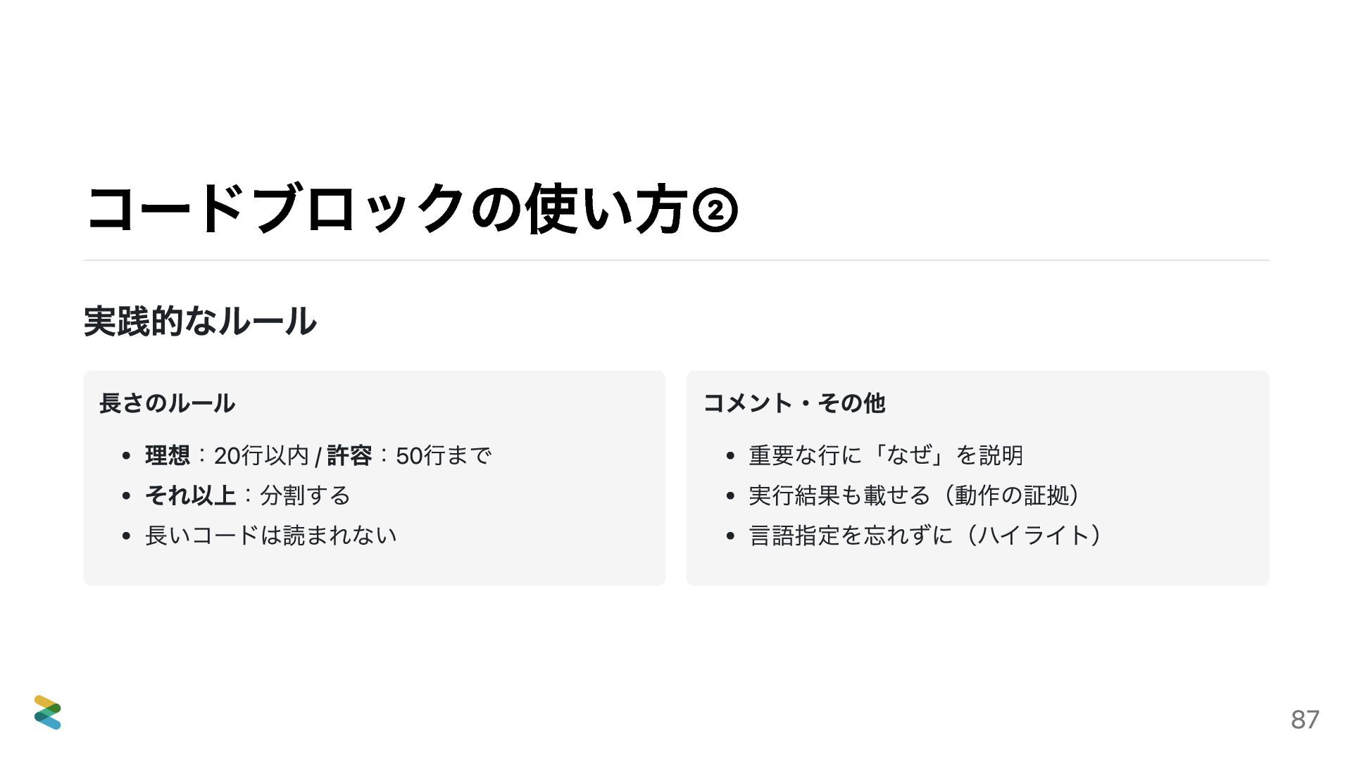 コードブロックの使い方② 実践的なルール 長さのルール 理想:20行以内 / 許容:50行まで それ以上:分割する 長いコードは読まれない コメント・その他 重要な行に「なぜ」を説明