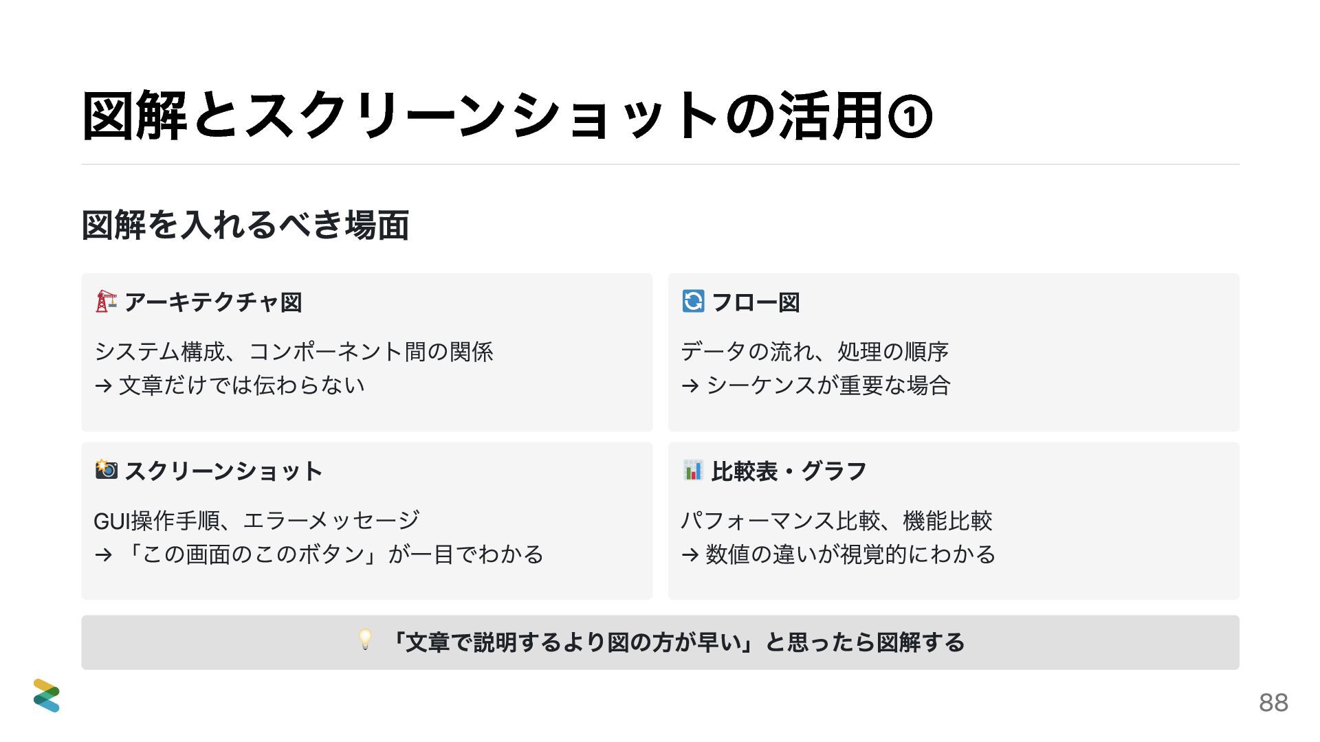 スクリーンショット GUI操作手順、エラーメッセージ → 「この画面のこのボタン」が一目でわかる 比較表・グラフ パフォーマンス比較、機能比較 → 数値の違いが視覚的にわかる 💡 「文章で説明するより図の方が早い」と思ったら図解する 90