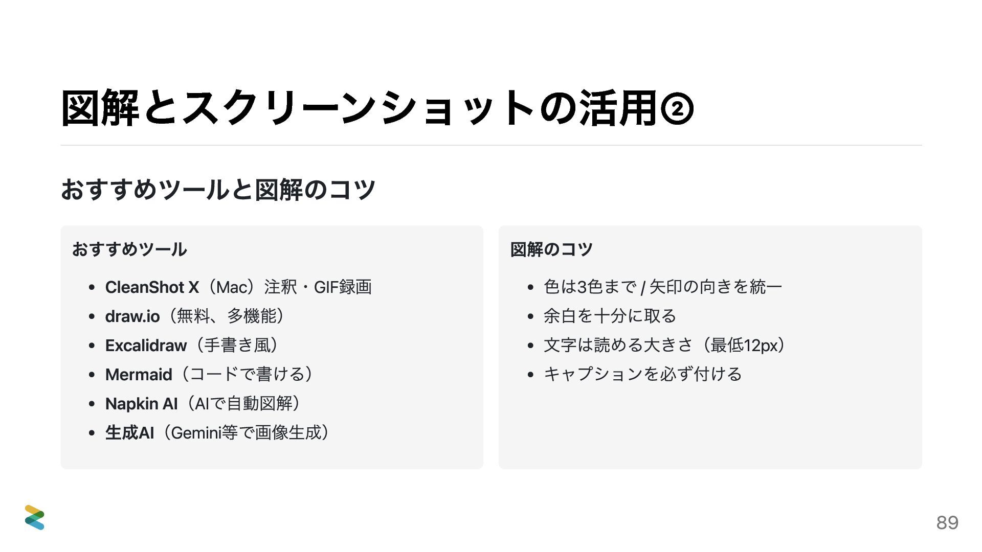 図解とスクリーンショットの活用② おすすめツールと図解のコツ おすすめツール CleanShot X(Mac)注釈・GIF録画 draw.io(無料、多機能) Excalidraw(手書き風) Mermaid(コードで書ける) Napkin AI(AIで自動図解)