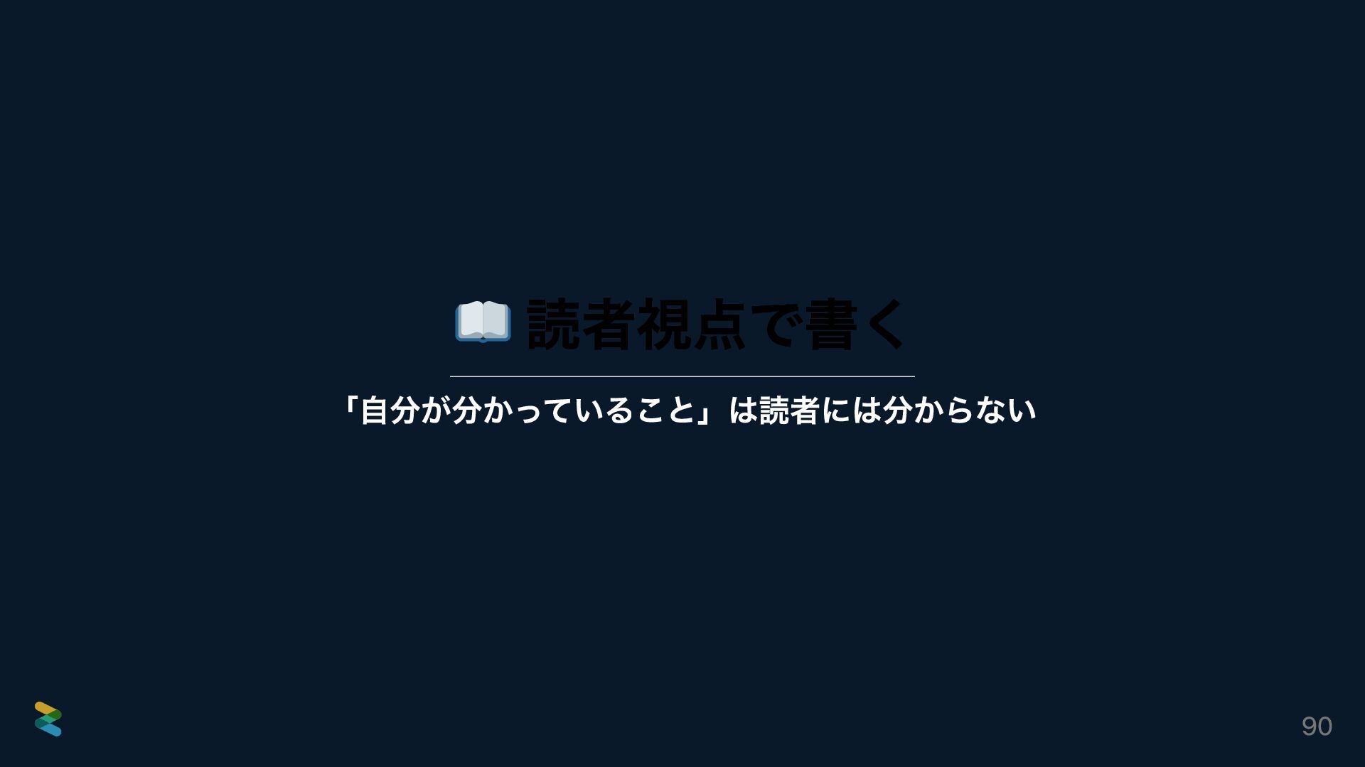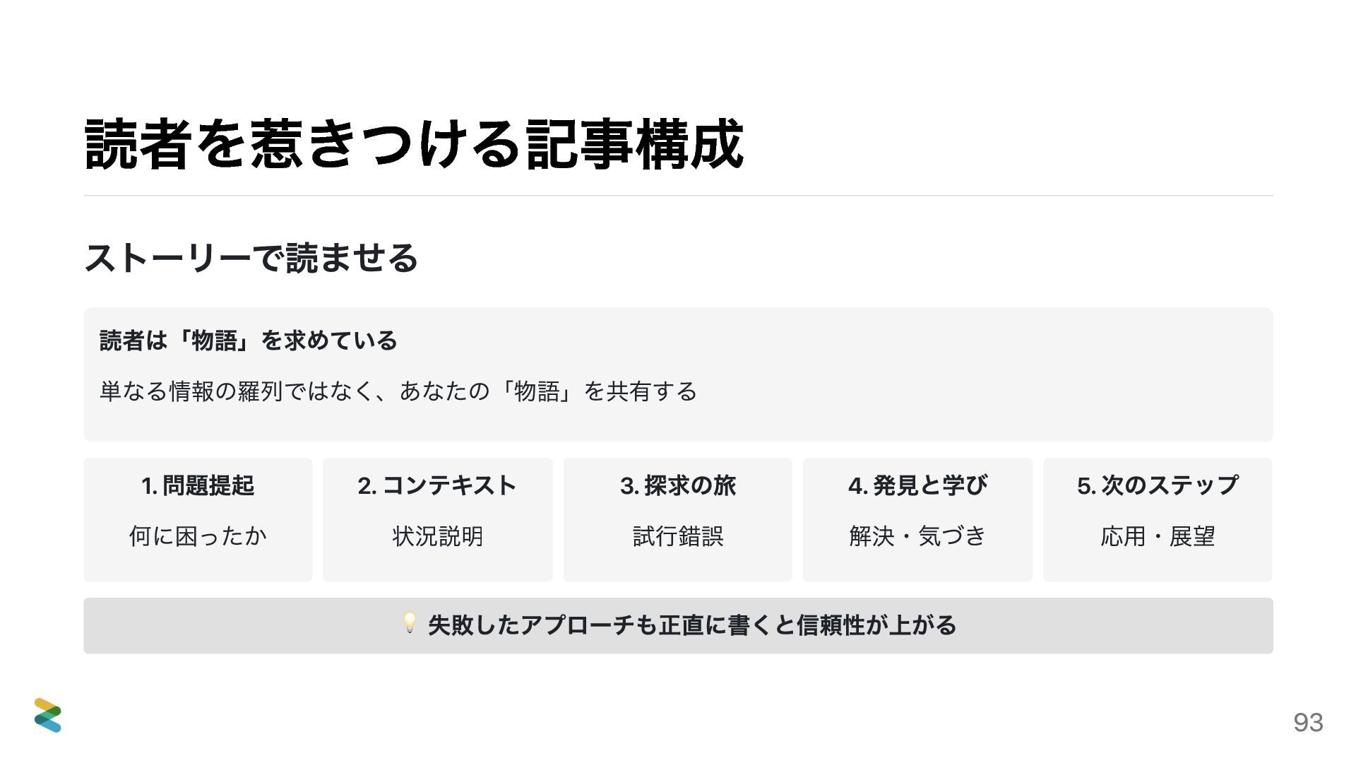前提知識がない(かもしれない) 何を試したか知らない なぜそれが正解か分からない 💡 「自分が当たり前に知っていること」を丁寧に書く。それが読者への誠実さ 93