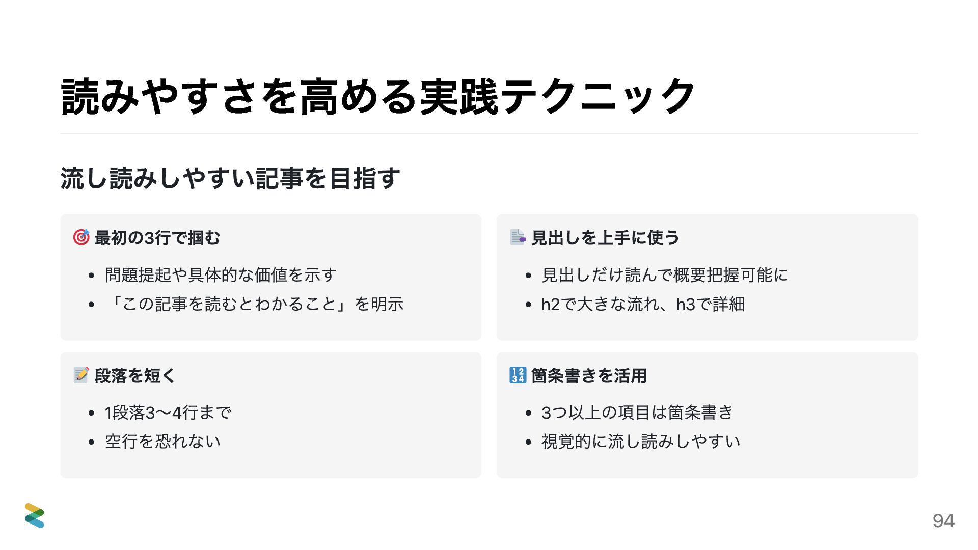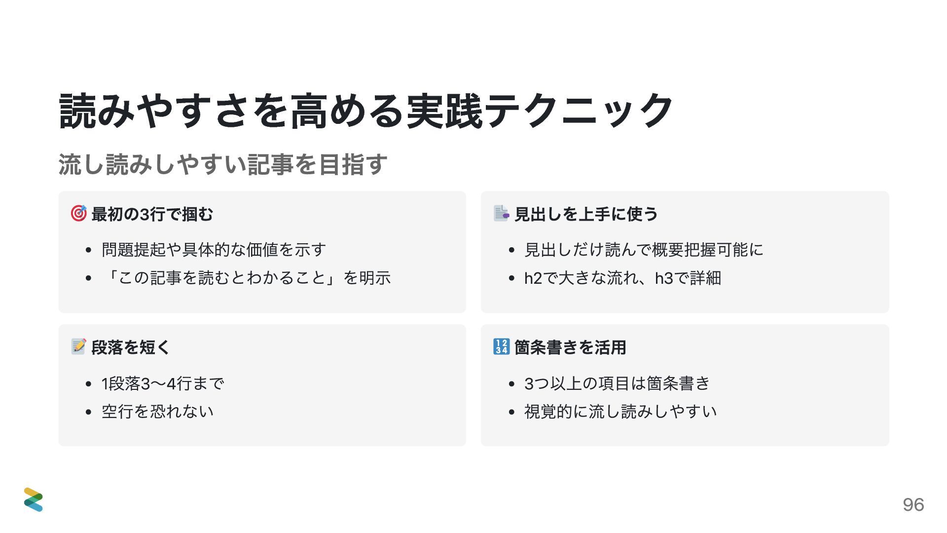 読みやすさを高める実践テクニック 流し読みしやすい記事を目指す 最初の3行で掴む 問題提起や具体的な価値を示す 「この記事を読むとわかること」を明示 見出しを上手に使う 見出しだけ読んで概要把握可能に h2で大きな流れ、h3で詳細 段落を短く 1段落3〜4行まで