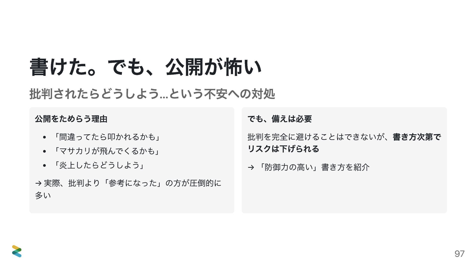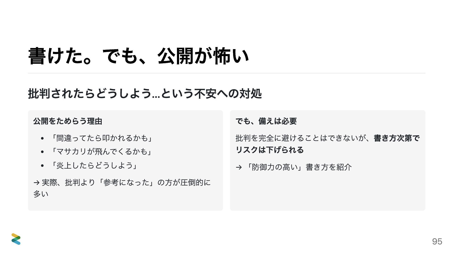 書けた。でも、公開が怖い 批判されたらどうしよう...という不安への対処 公開をためらう理由 「間違ってたら叩かれるかも」 「マサカリが飛んでくるかも」 「炎上したらどうしよう」 → 実際、批判より「参考になった」の方が圧倒的に 多い でも、備えは必要