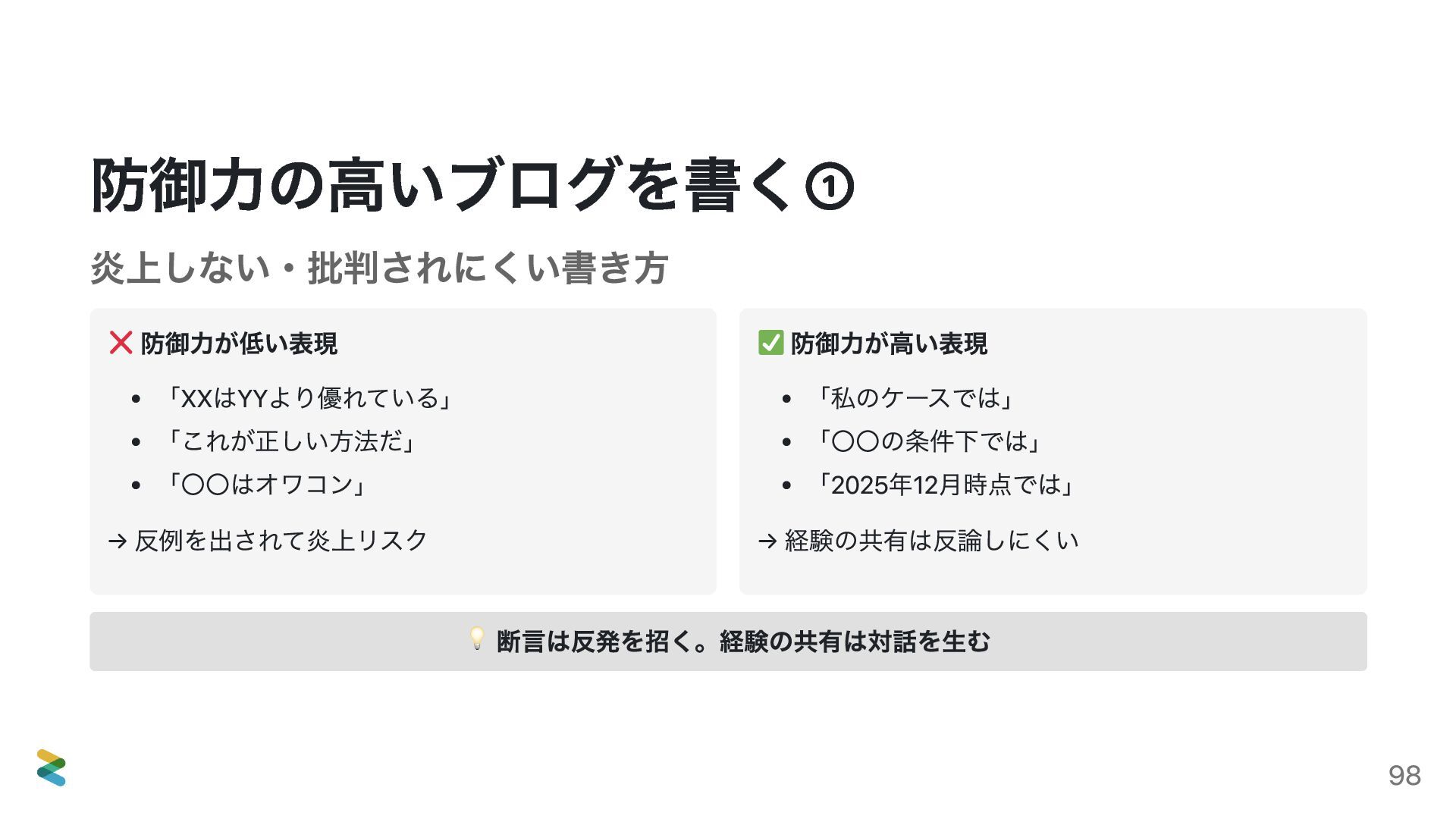 防御力の高いブログを書く① 炎上しない・批判されにくい書き方 防御力が低い表現 「XXはYYより優れている」 「これが正しい方法だ」 「〇〇はオワコン」 → 反例を出されて炎上リスク 防御力が高い表現 「私のケースでは」