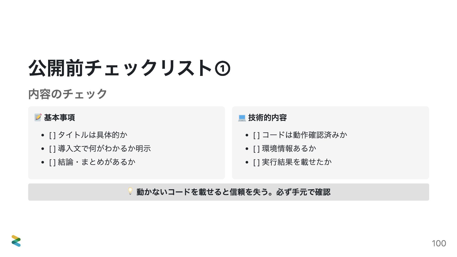 ] 結論・まとめがあるか 技術的内容 [ ] コードは動作確認済みか [ ] 環境情報あるか [ ] 実行結果を載せたか 💡 動かないコードを載せると信頼を失う。必ず手元で確認 100