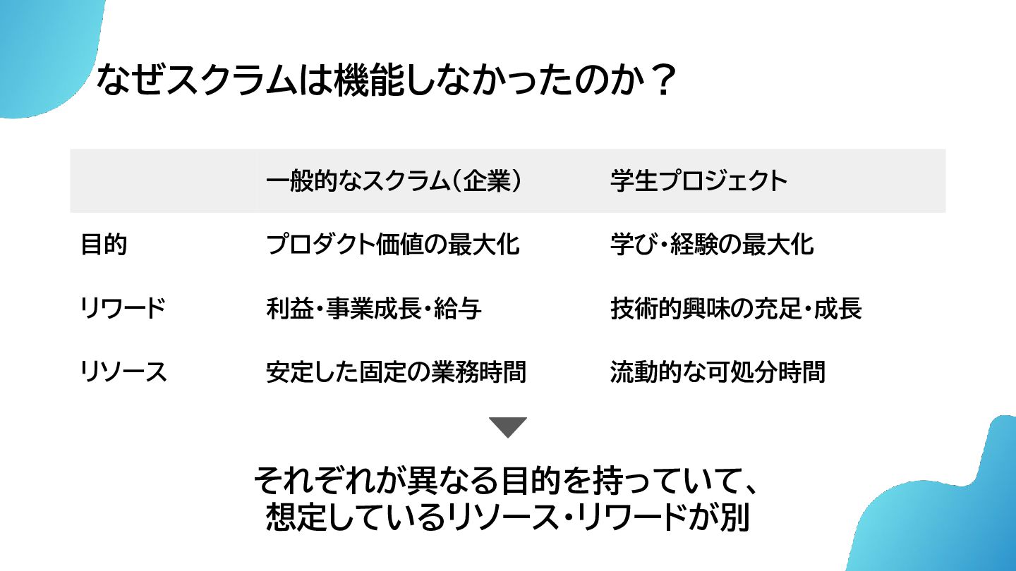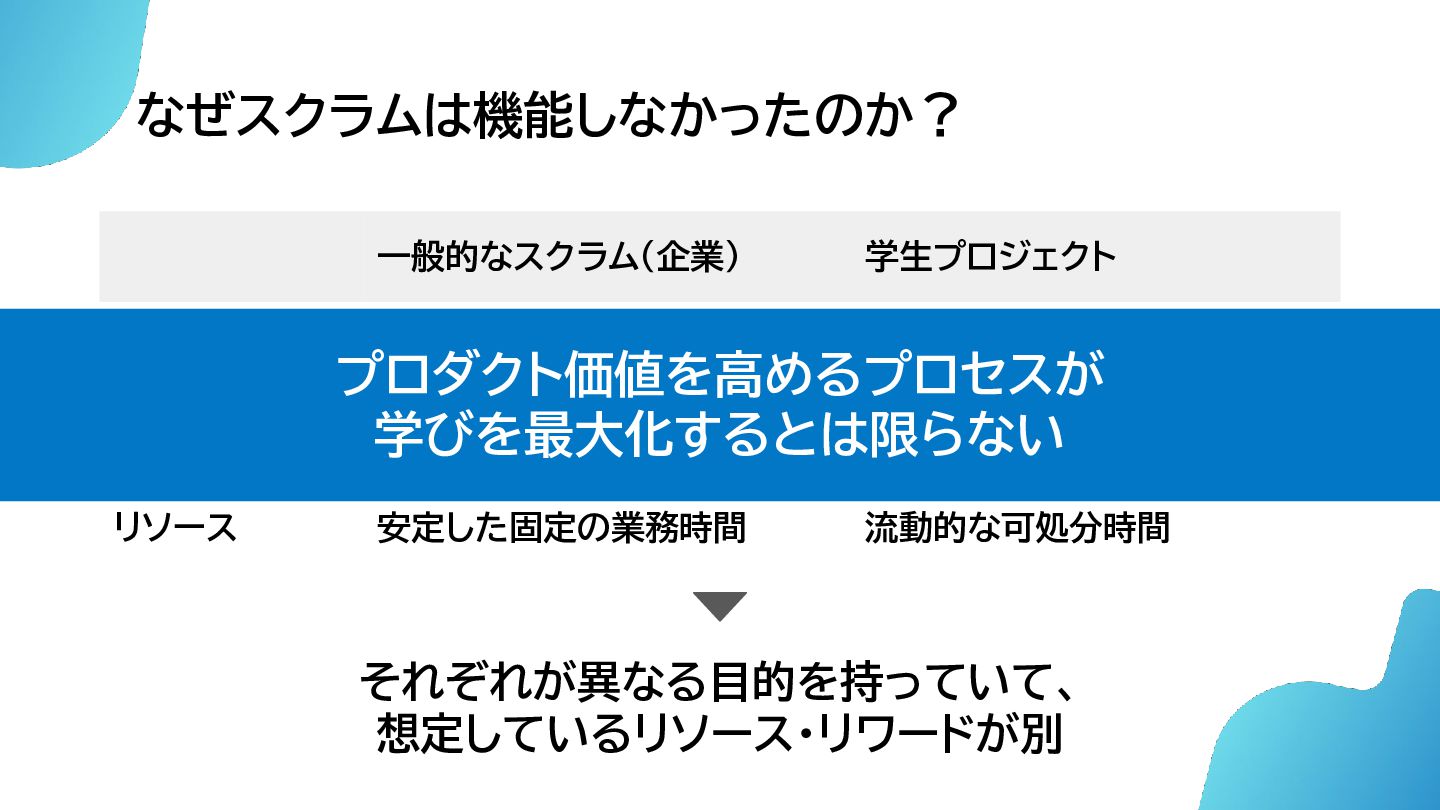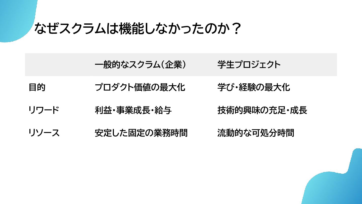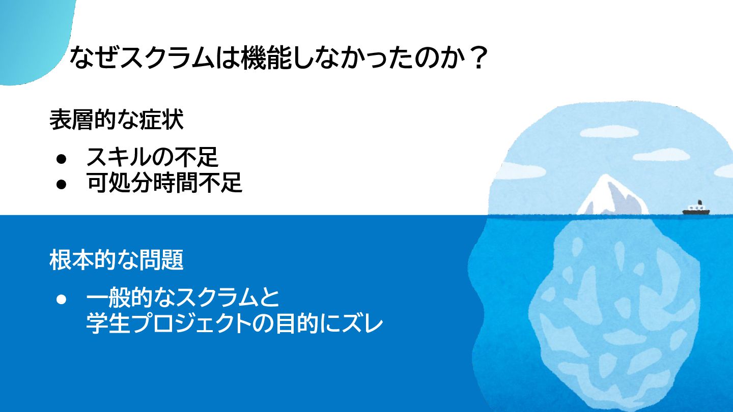 なぜスクラムは機能しなかったのか? 表層的な症状 • スキルの不足 • 可処分時間不足 根本的な問題 • 一般的なスクラムと 学生プロジェクトの目的にズレ