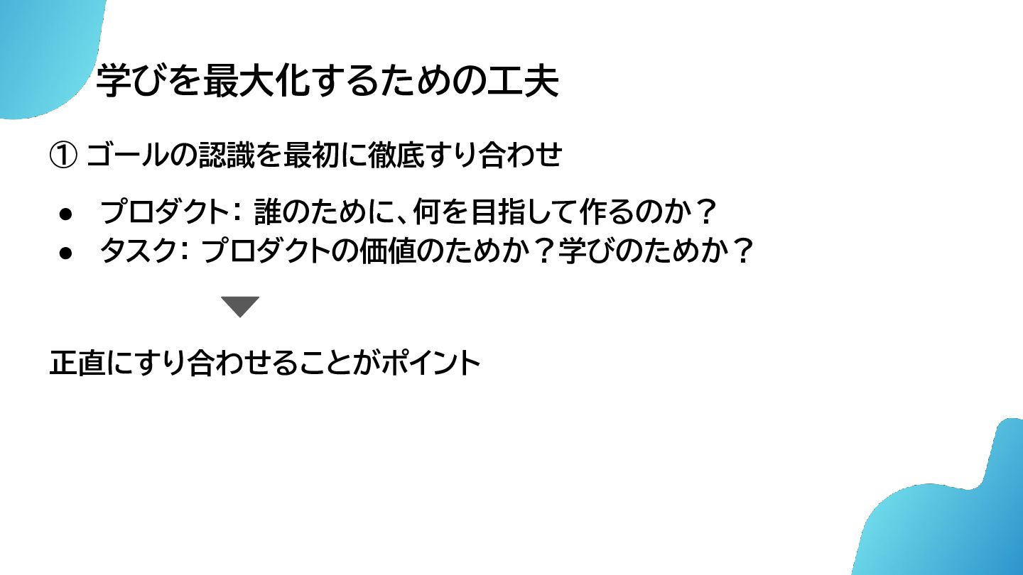 学びを最大化するための工夫 ① ゴールの認識を最初に徹底すり合わせ • プロダクト: 誰のために、何を目指して作るのか? • タスク: プロダクトの価値のためか?学びのためか? 正直にすり合わせることがポイント