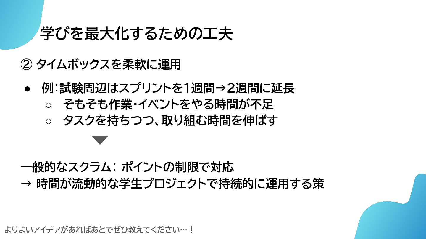 学びを最大化するための工夫 ② タイムボックスを柔軟に運用 • 例:試験周辺はスプリントを1週間→2週間に延長 ◦ そもそも作業・イベントをやる時間が不足 ◦ タスクを持ちつつ、取り組む時間を伸ばす 一般的なスクラム: