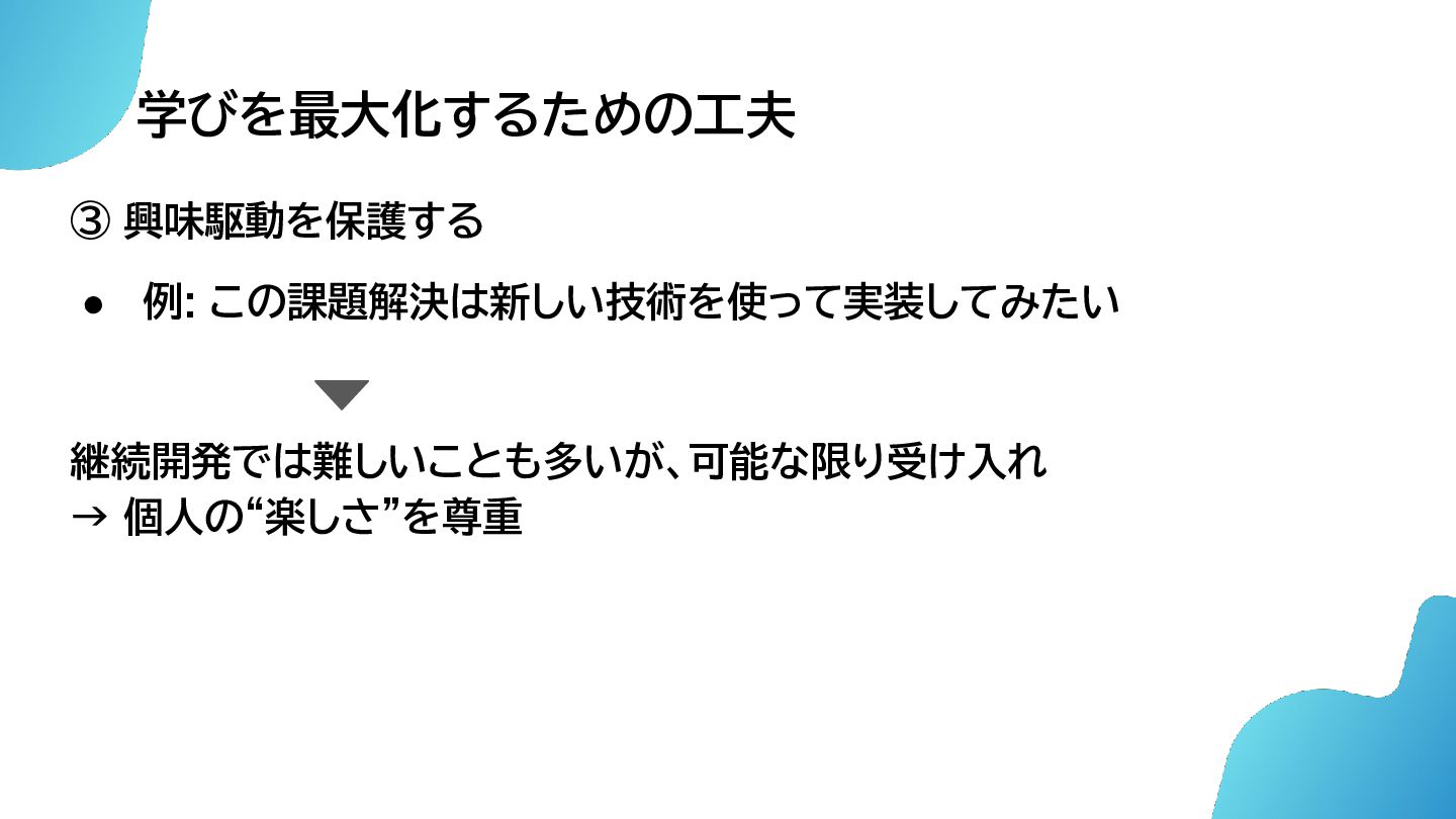 学びを最大化するための工夫 ③ 興味駆動を保護する • 例: この課題解決は新しい技術を使って実装してみたい 継続開発では難しいことも多いが、可能な限り受け入れ → 個人の“楽しさ”を尊重