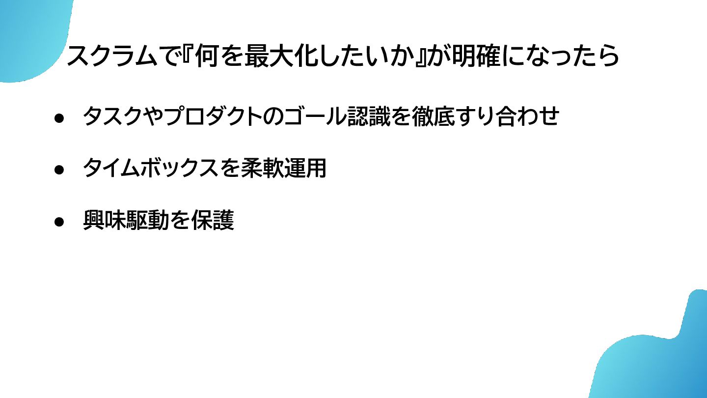 スクラムで『何を最大化したいか』が明確になったら • タスクやプロダクトのゴール認識を徹底すり合わせ • タイムボックスを柔軟運用 • 興味駆動を保護