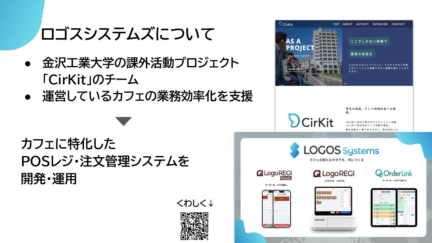 ロゴスシステムズについて • 金沢工業大学の課外活動プロジェクト 「CirKit」のチーム • 運営しているカフェの業務効率化を支援 カフェに特化した POSレジ・注文管理システムを 開発・運用 くわしく↓