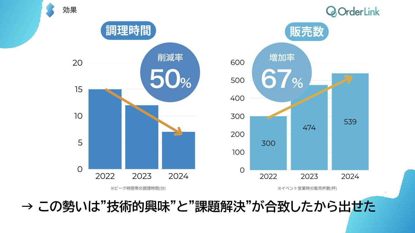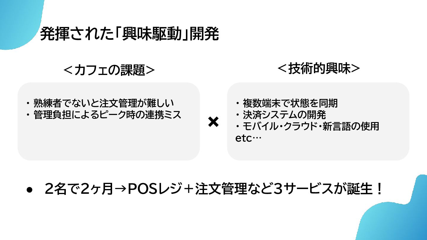 発揮された「興味駆動」開発 • 2名で2ヶ月→POSレジ+注文管理など3サービスが誕生! ・ 熟練者でないと注文管理が難しい ・ 管理負担によるピーク時の連携ミス ・ 複数端末で状態を同期 ・