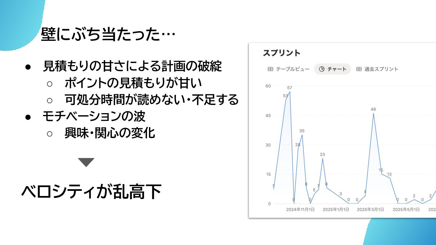壁にぶち当たった… • 見積もりの甘さによる計画の破綻 ◦ ポイントの見積もりが甘い ◦ 可処分時間が読めない・不足する • モチベーションの波 ◦