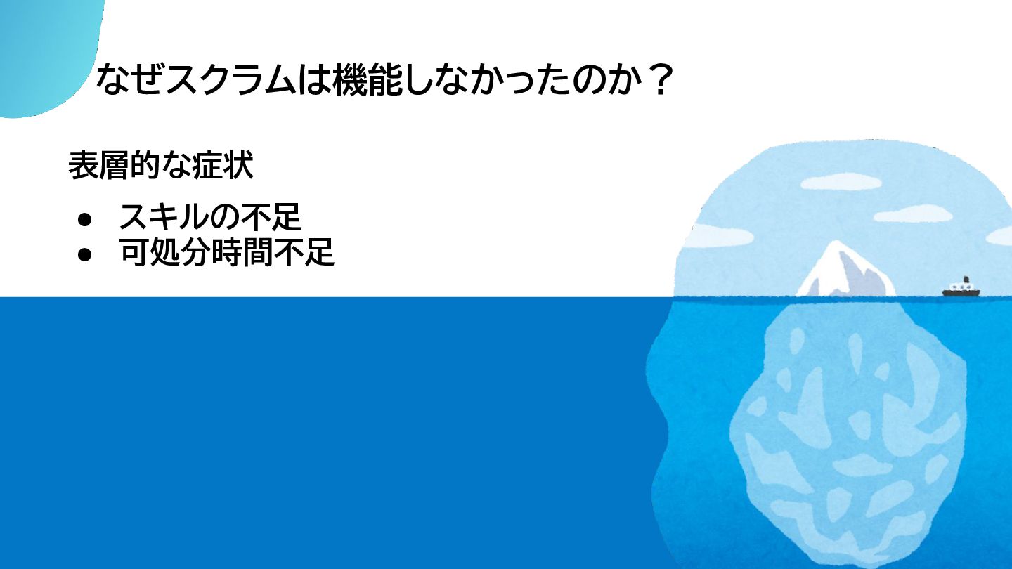 なぜスクラムは機能しなかったのか? 表層的な症状 • スキルの不足 • 可処分時間不足