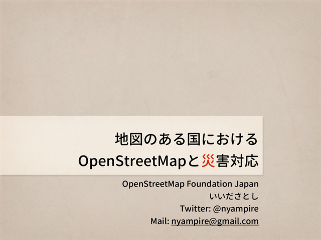 き飛ばされる前のデータが無いと被災者数の推計ができない」という意見がでている ❖ フィリピン台風災害(Haiyan, Yolanda. 2013)の際には、航空写真を基にした建物 への被害アセスメント実施の試みがあった ❖ 米国赤十字による最終結論としては「あまり役に立たなかった」という判断 ❖ http://americanredcross.github.io/OSM-Assessment/ ❖ At present, damage assessment data in OpenStreetMap falls short of the reliability rates needed to make it a credible, useful source for damage analysis. ❖ だからこそ、Missing MapやMapGiveなど、事前の地図作成に力が入れられている