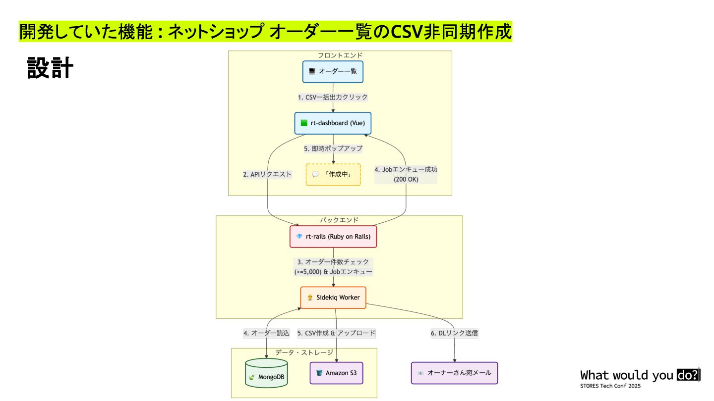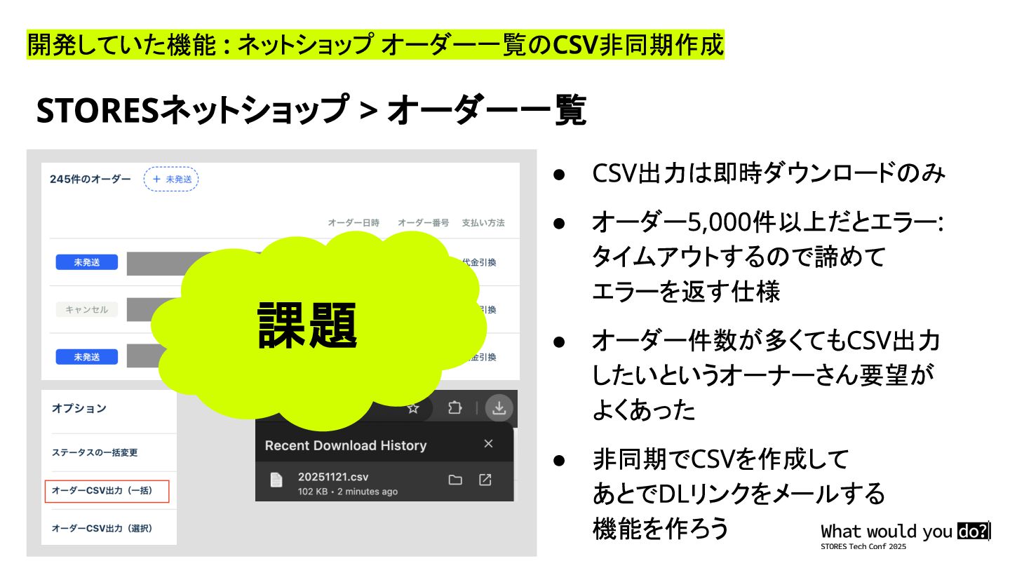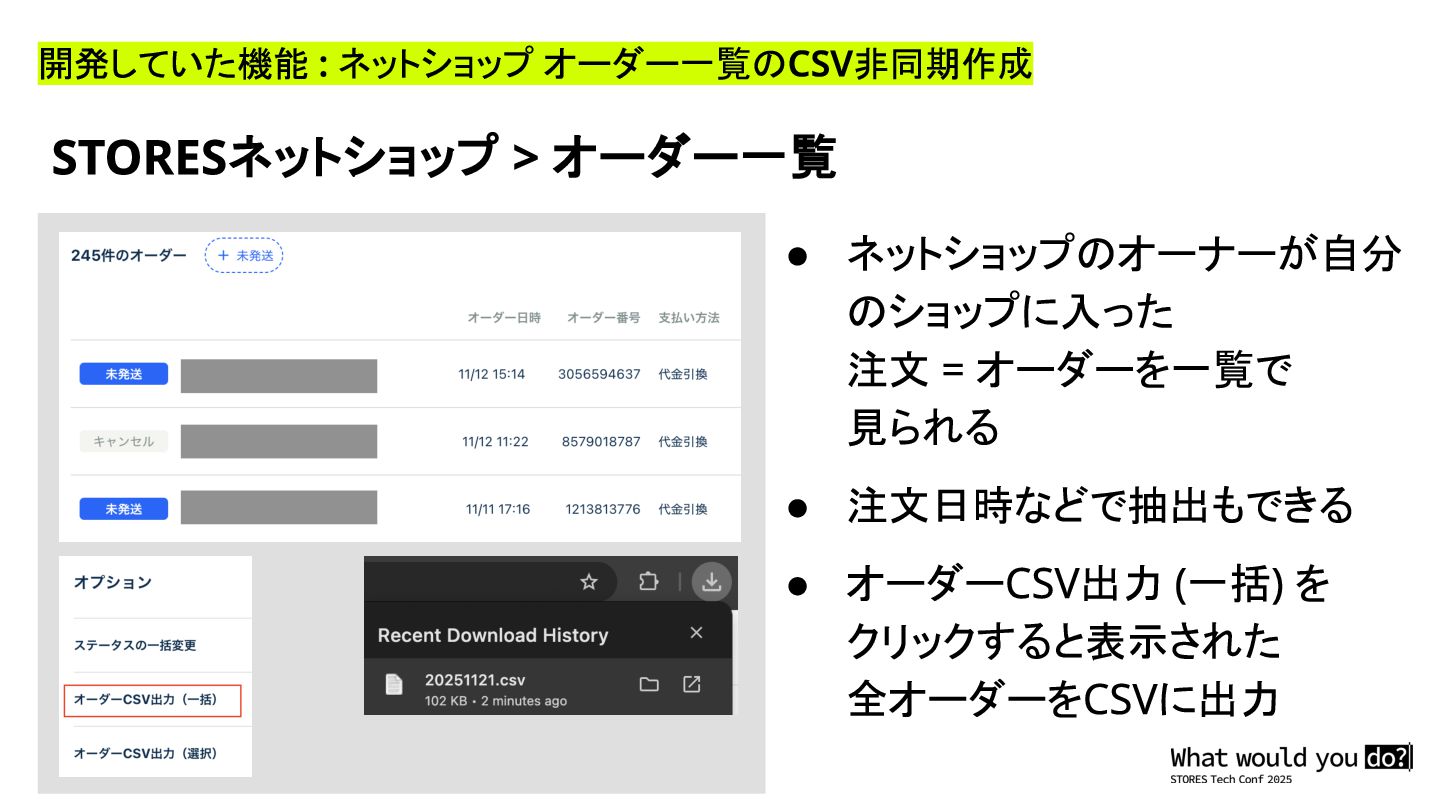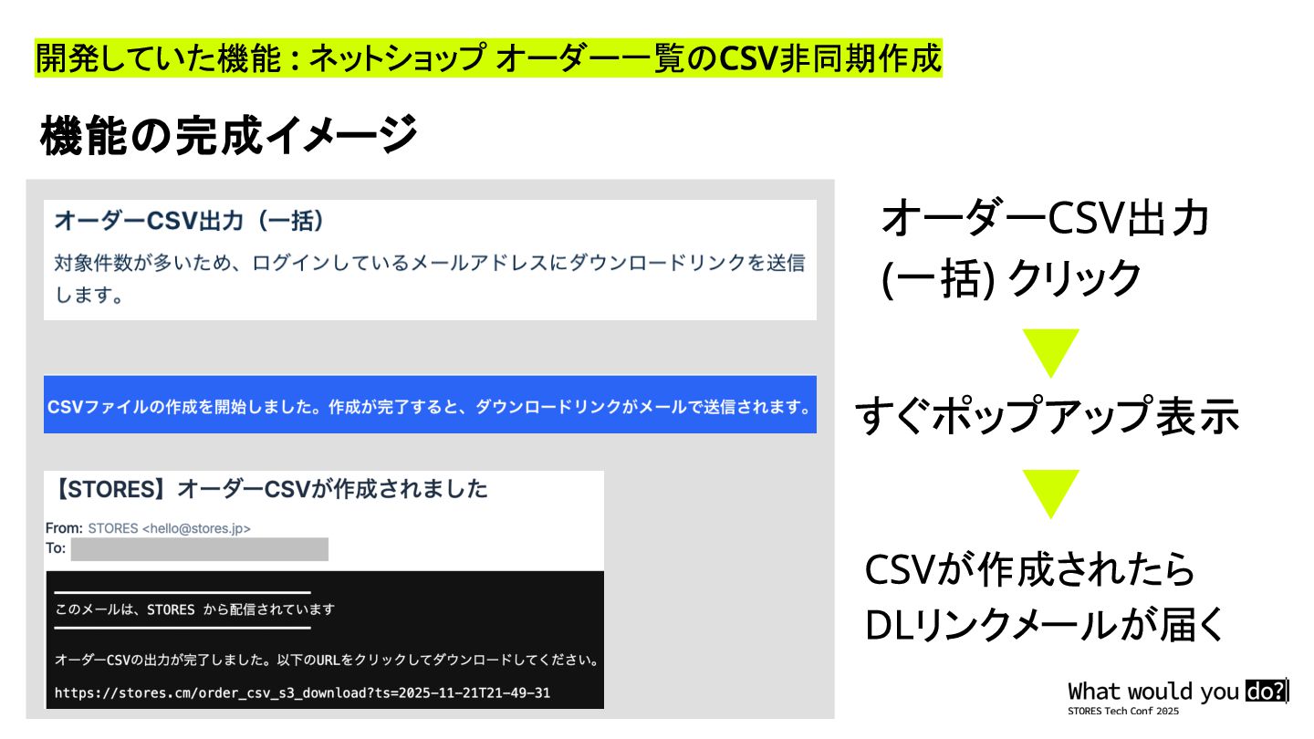 STORES ネットショップ には、オーダー一覧をCSVエクスポートする機能があります。オーダー件数が多いとタイムアウトする課題があったため、オーダーが5,000件以上の場合、SidekiqでCSVを非同期作成してメール送信する機能を開発しました。