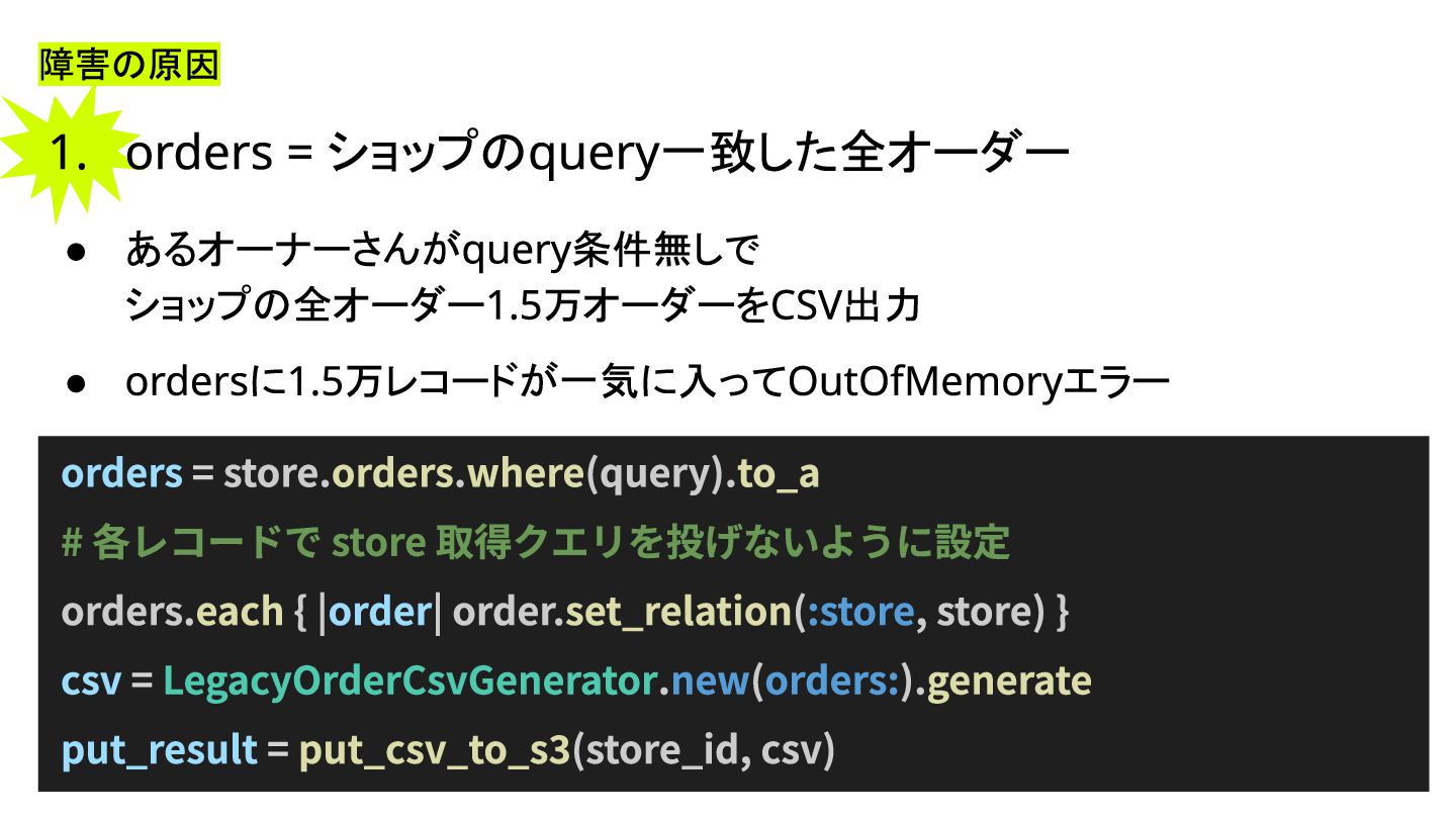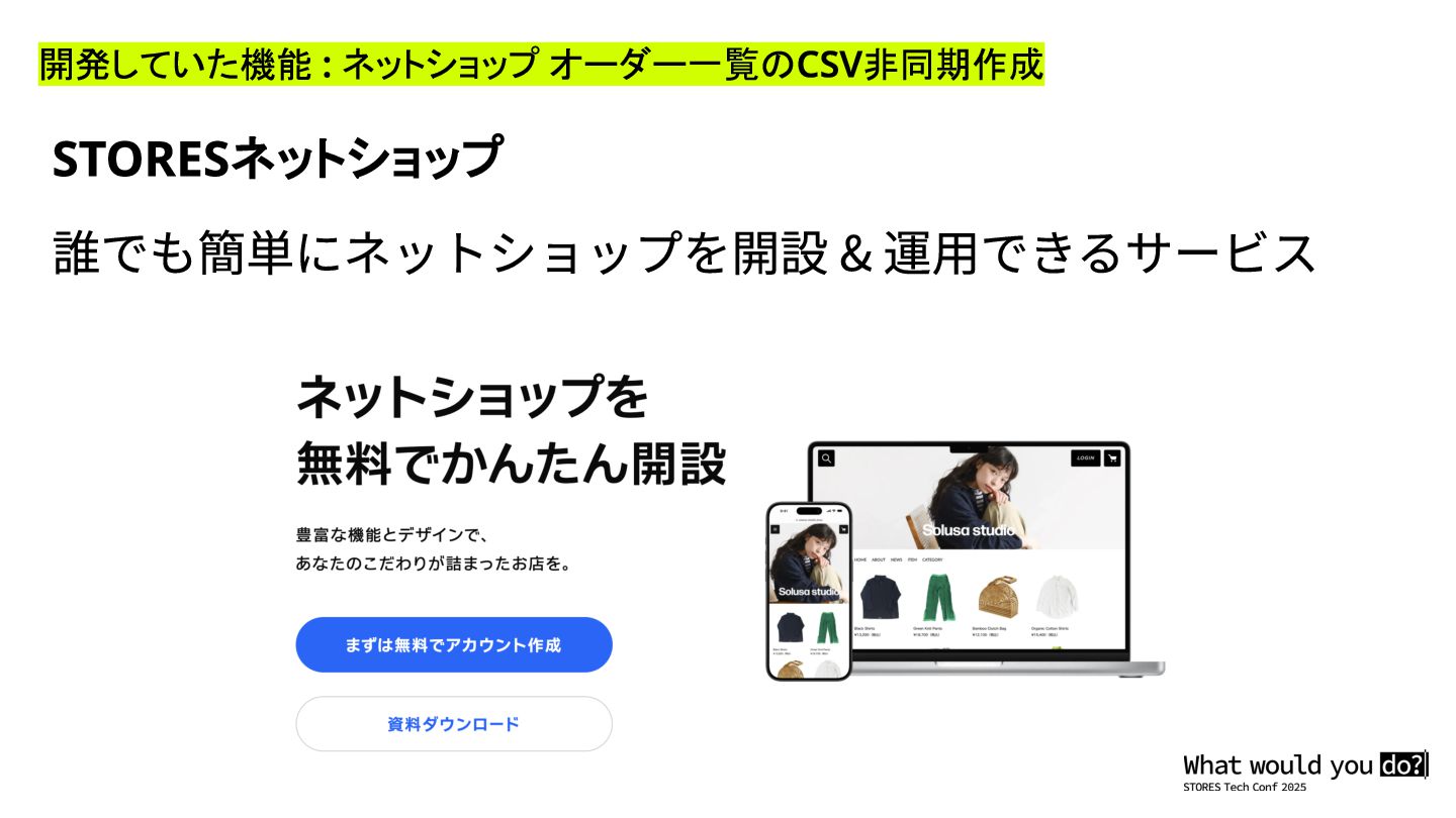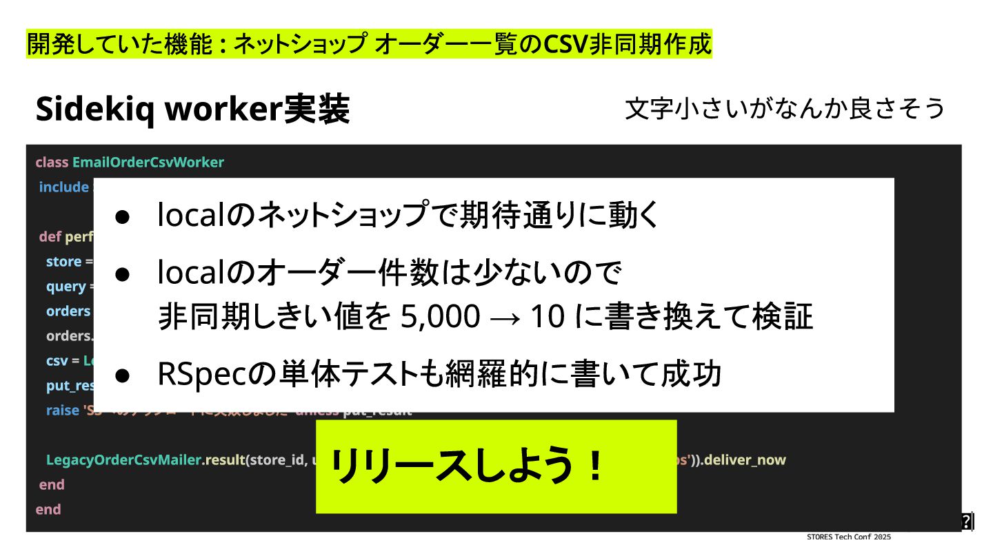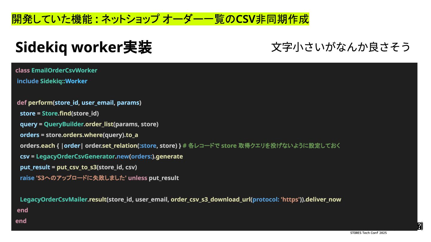 STORES ネットショップ には、オーダー一覧をCSVエクスポートする機能があります。オーダー件数が多いとタイムアウトする課題があったため、オーダーが5,000件以上の場合、SidekiqでCSVを非同期作成してメール送信する機能を開発しました。