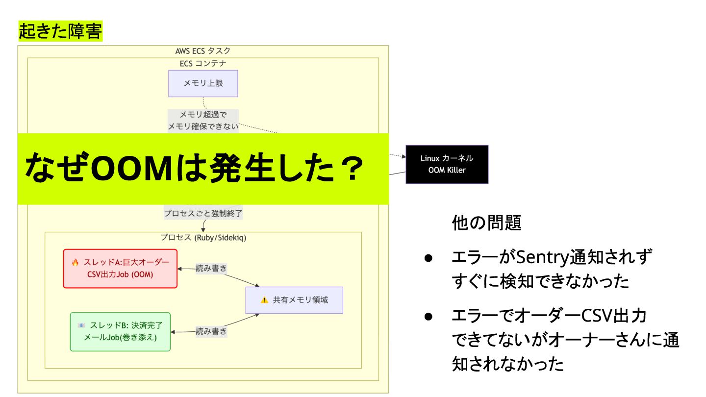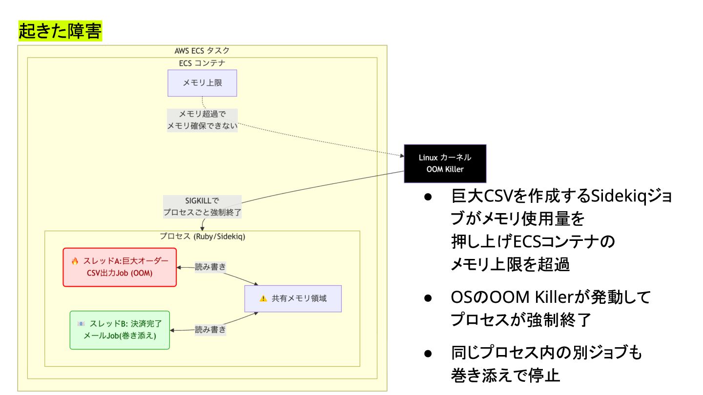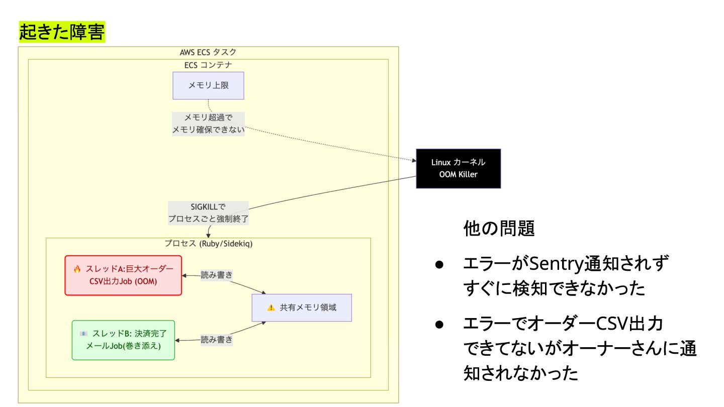 ところがリリース後、SidekiqのコンテナがOutOfMemoryエラーで強制終了する障害が発生しました。