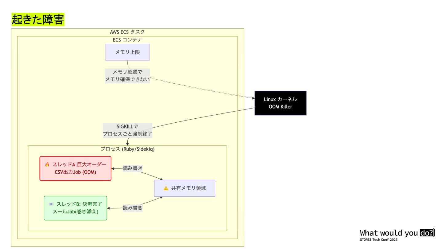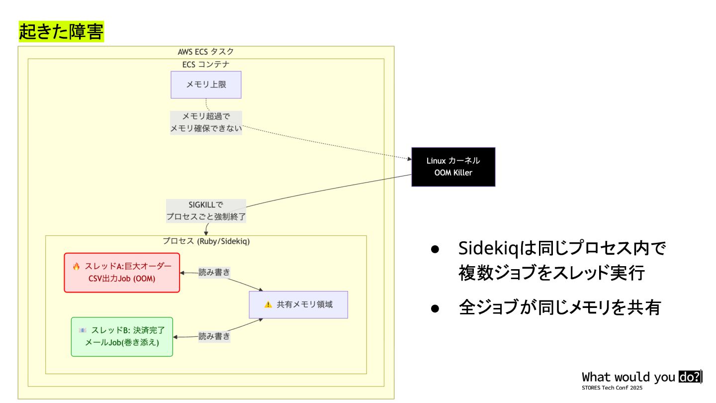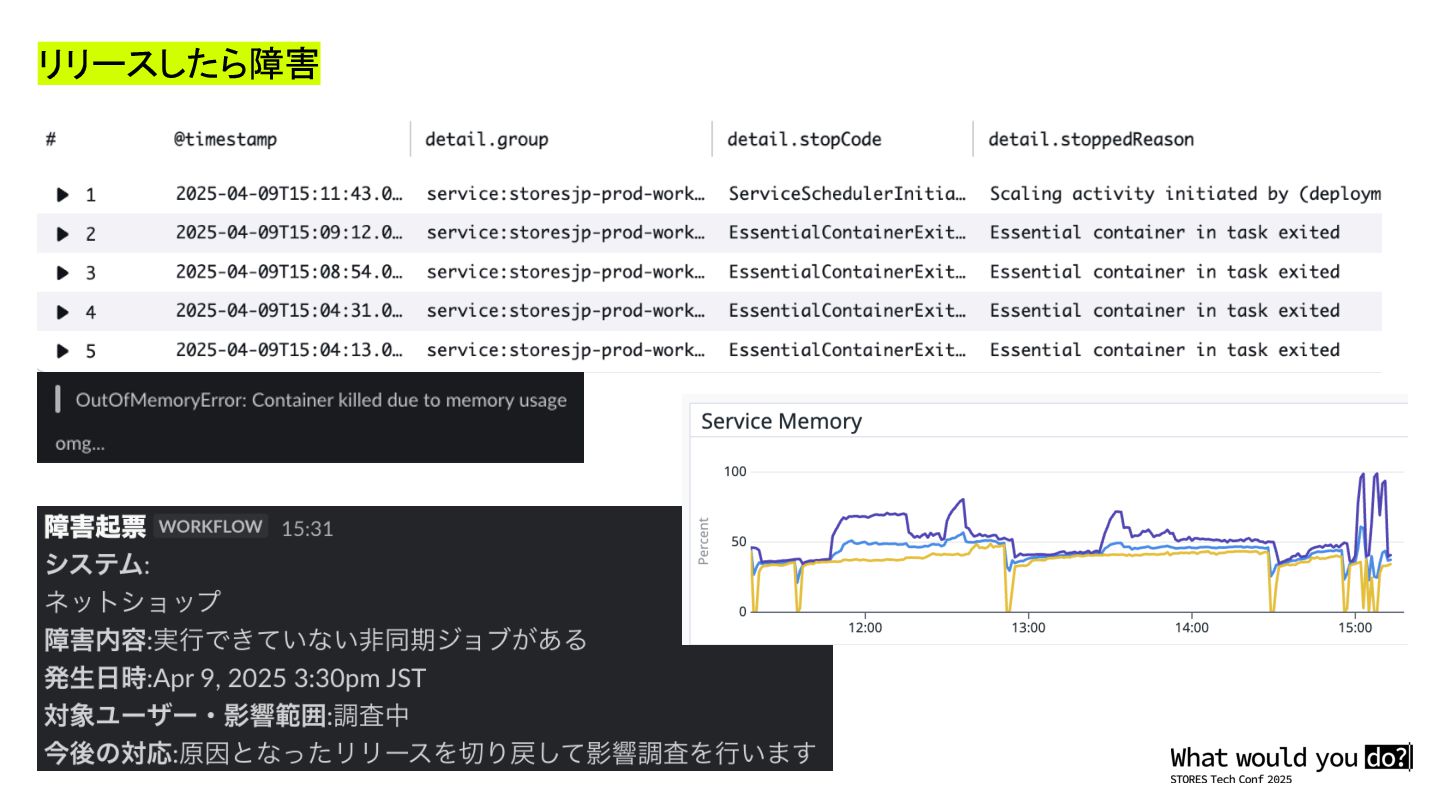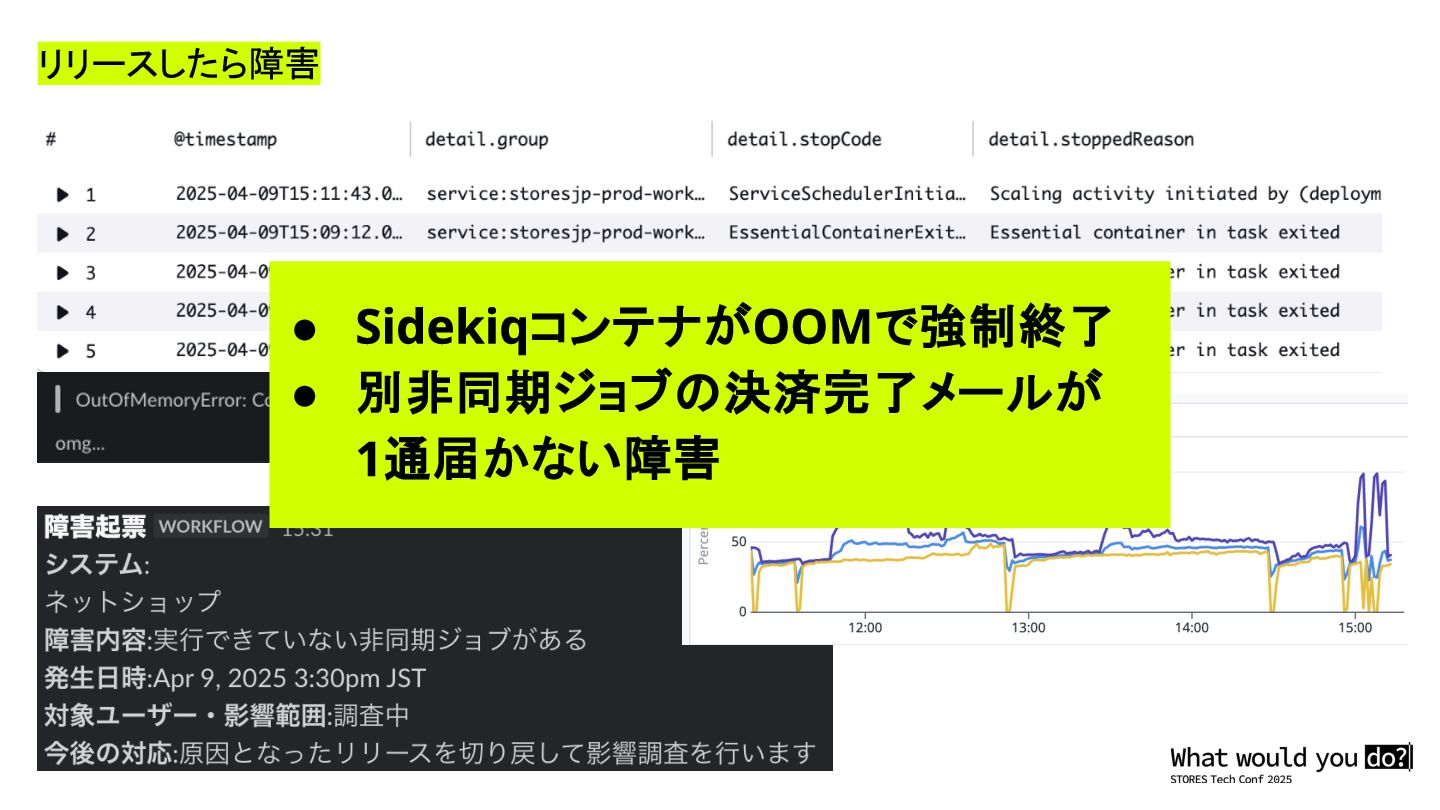 ところがリリース後、SidekiqのコンテナがOutOfMemoryエラーで強制終了する障害が発生しました。