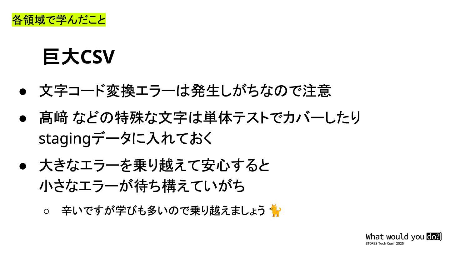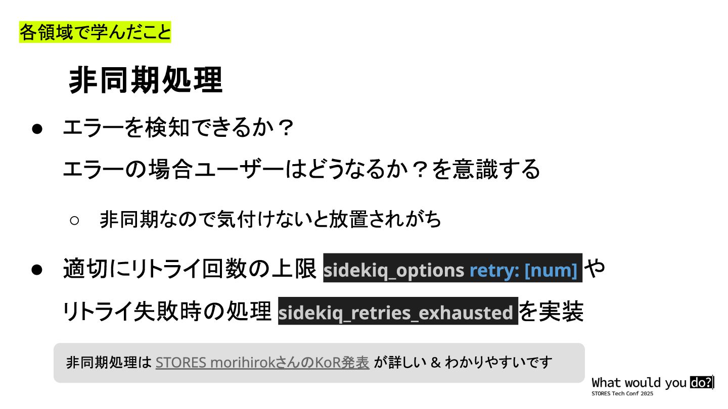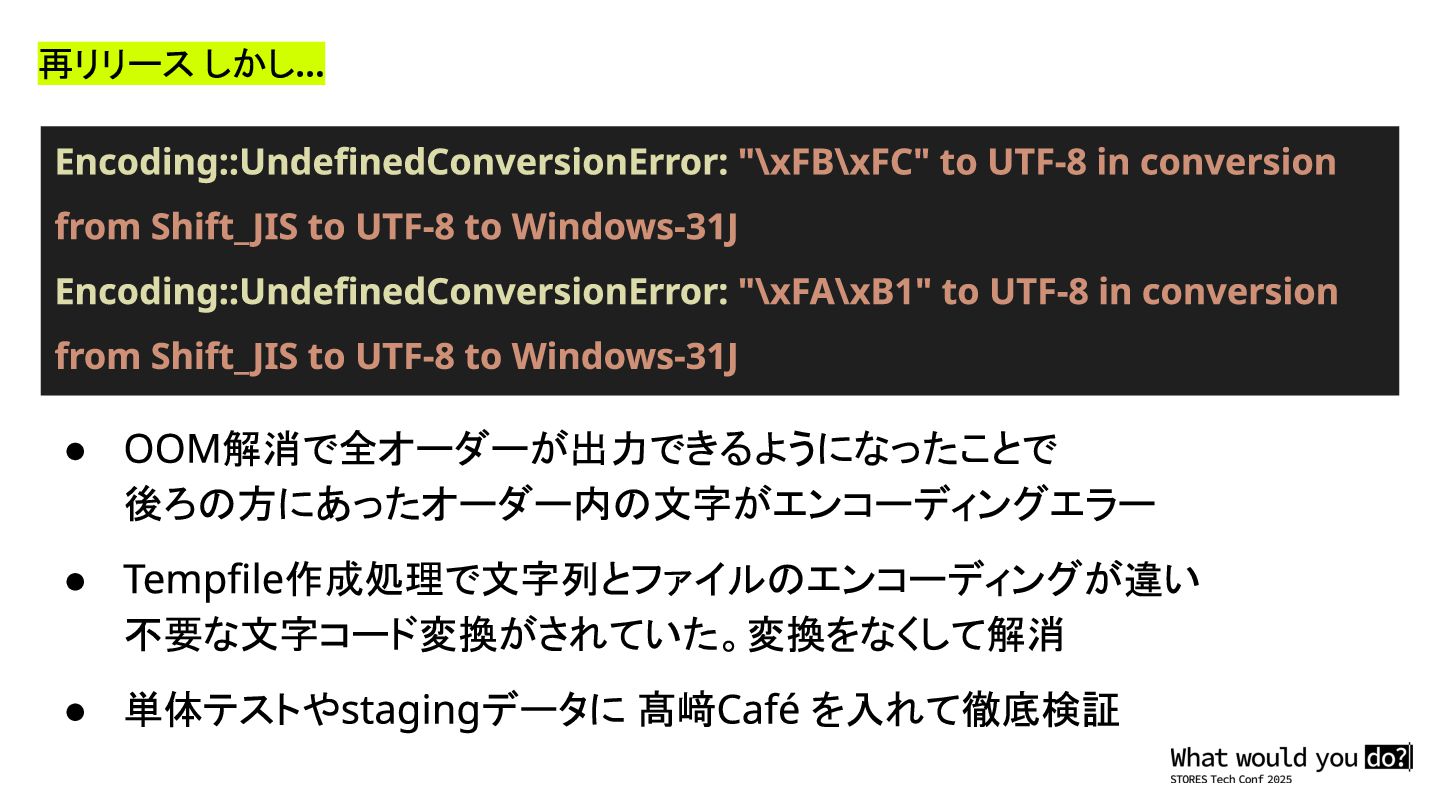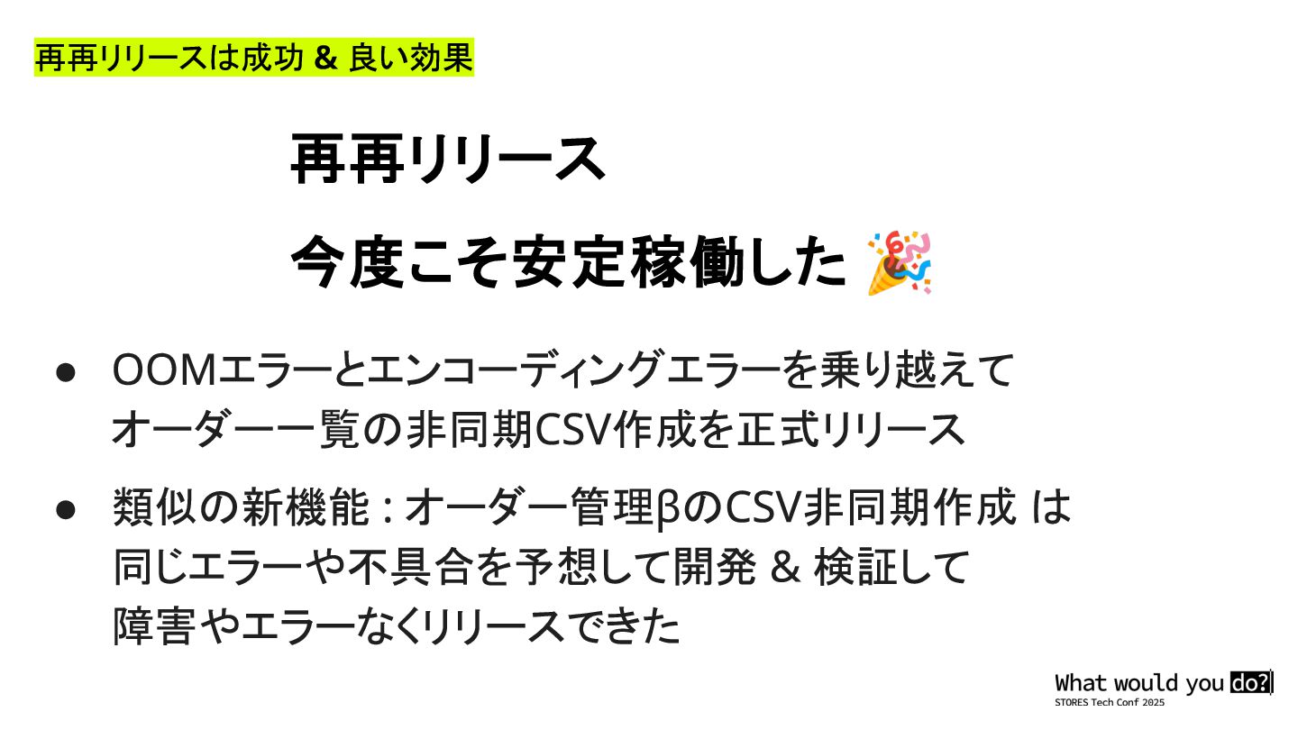 この障害に対し、データ分割処理やTempfileでメモリ効率を改善するとともに、Sidekiqのリトライ処理や失敗通知を実装しました。さらに本番同等のデータで徹底検証を行い、別のあるあるエラーも乗り越えて、機能の安定稼働を実現しました。この経験を活かして、次の類似機能は迅速に障害無くリリースできました。