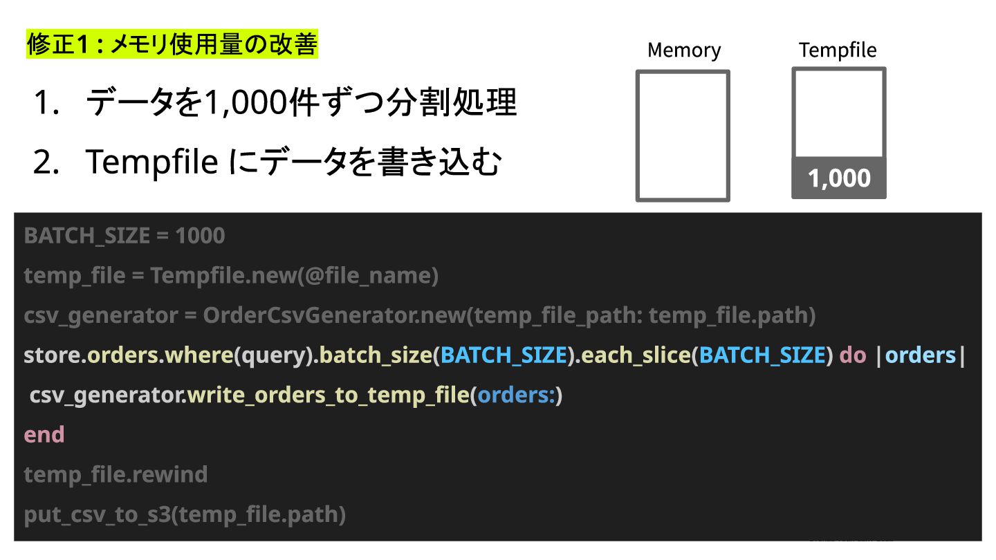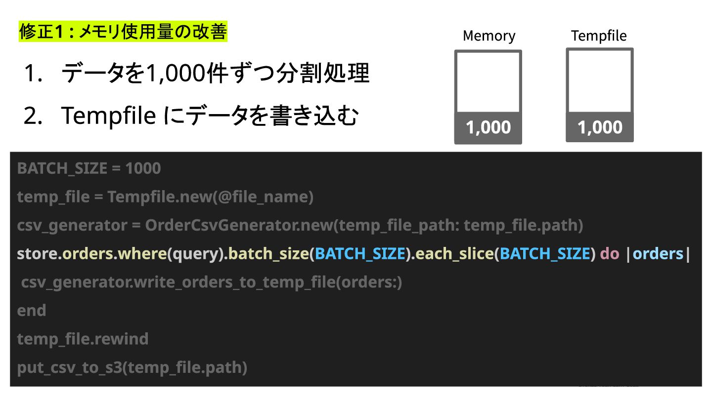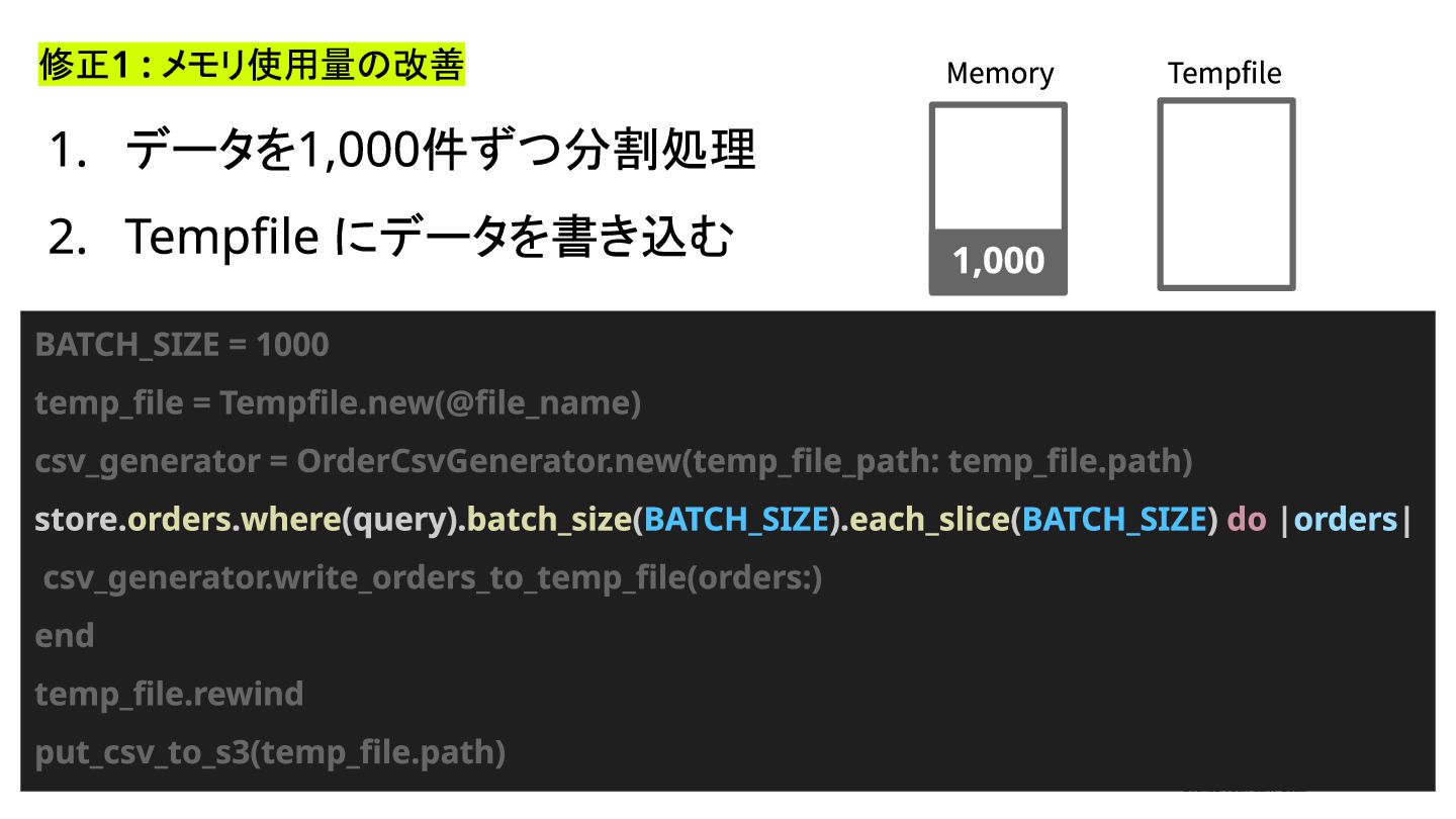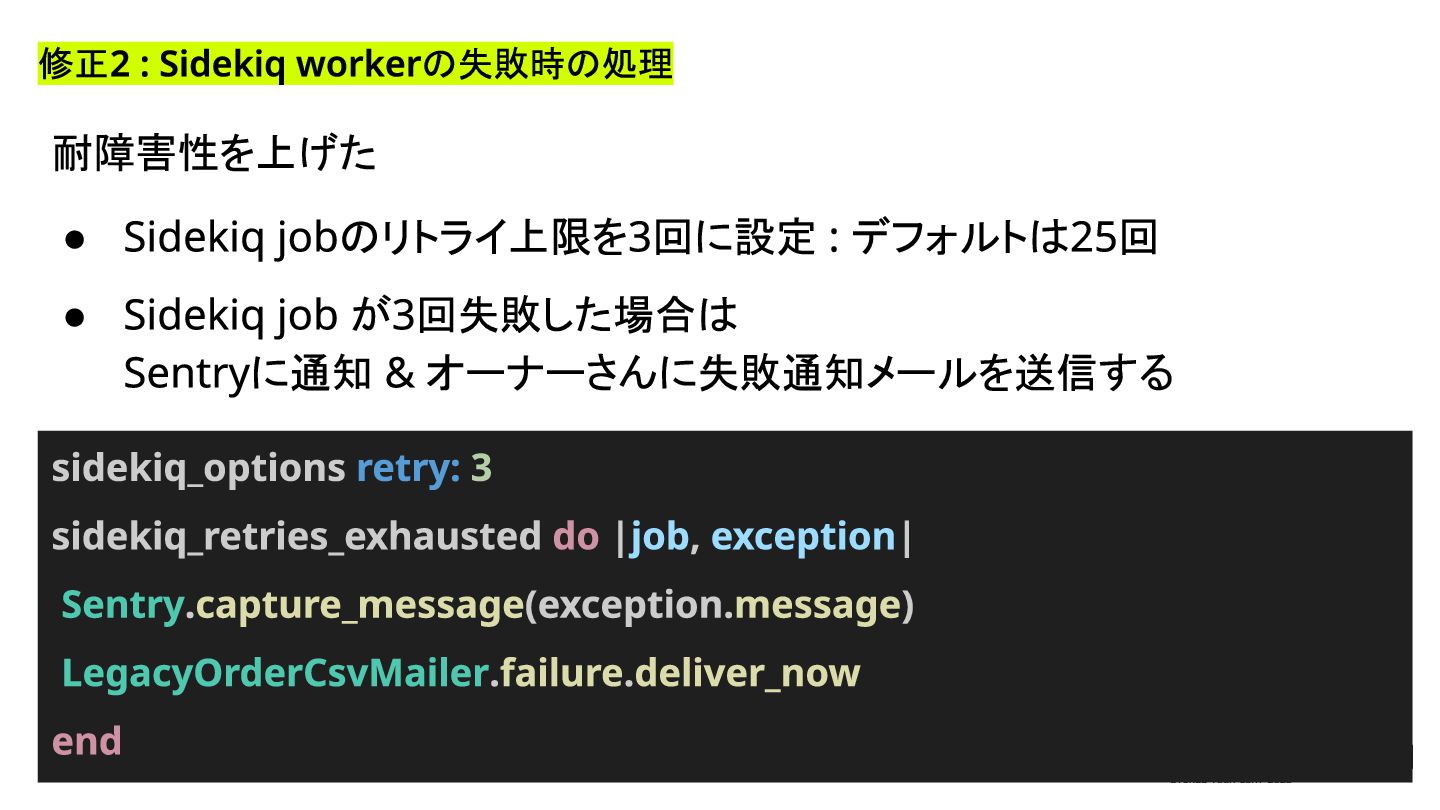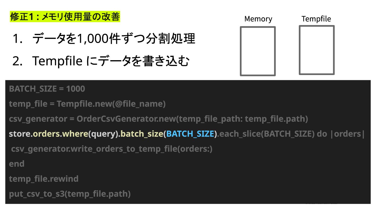 この障害に対し、データ分割処理やTempfileでメモリ効率を改善するとともに、Sidekiqのリトライ処理や失敗通知を実装しました。さらに本番同等のデータで徹底検証を行い、別のあるあるエラーも乗り越えて、機能の安定稼働を実現しました。この経験を活かして、次の類似機能は迅速に障害無くリリースできました。