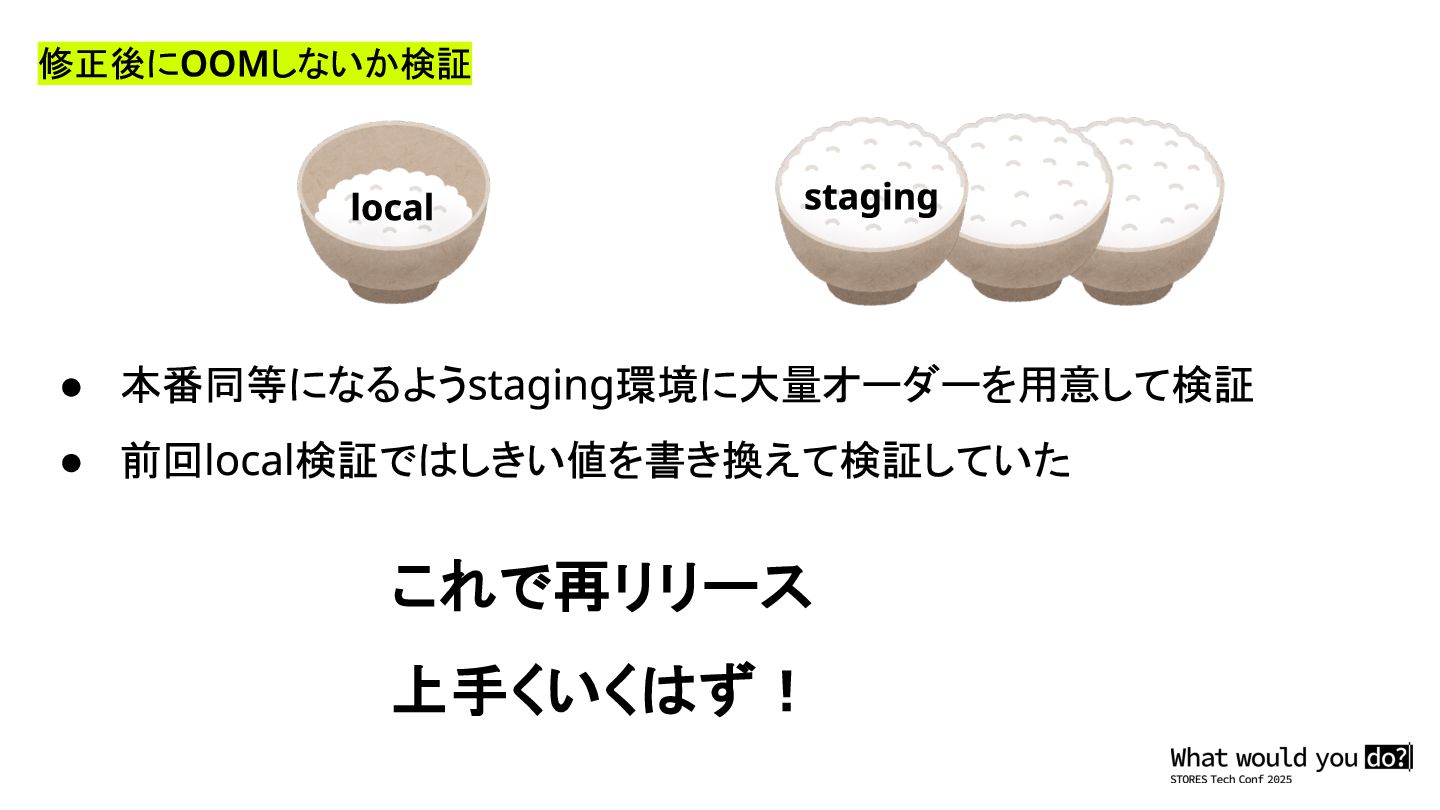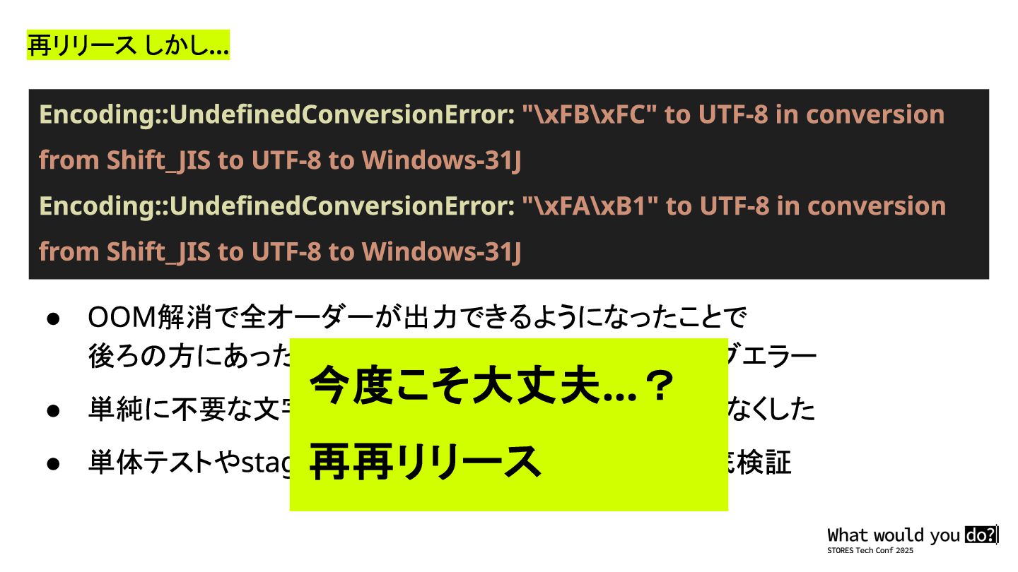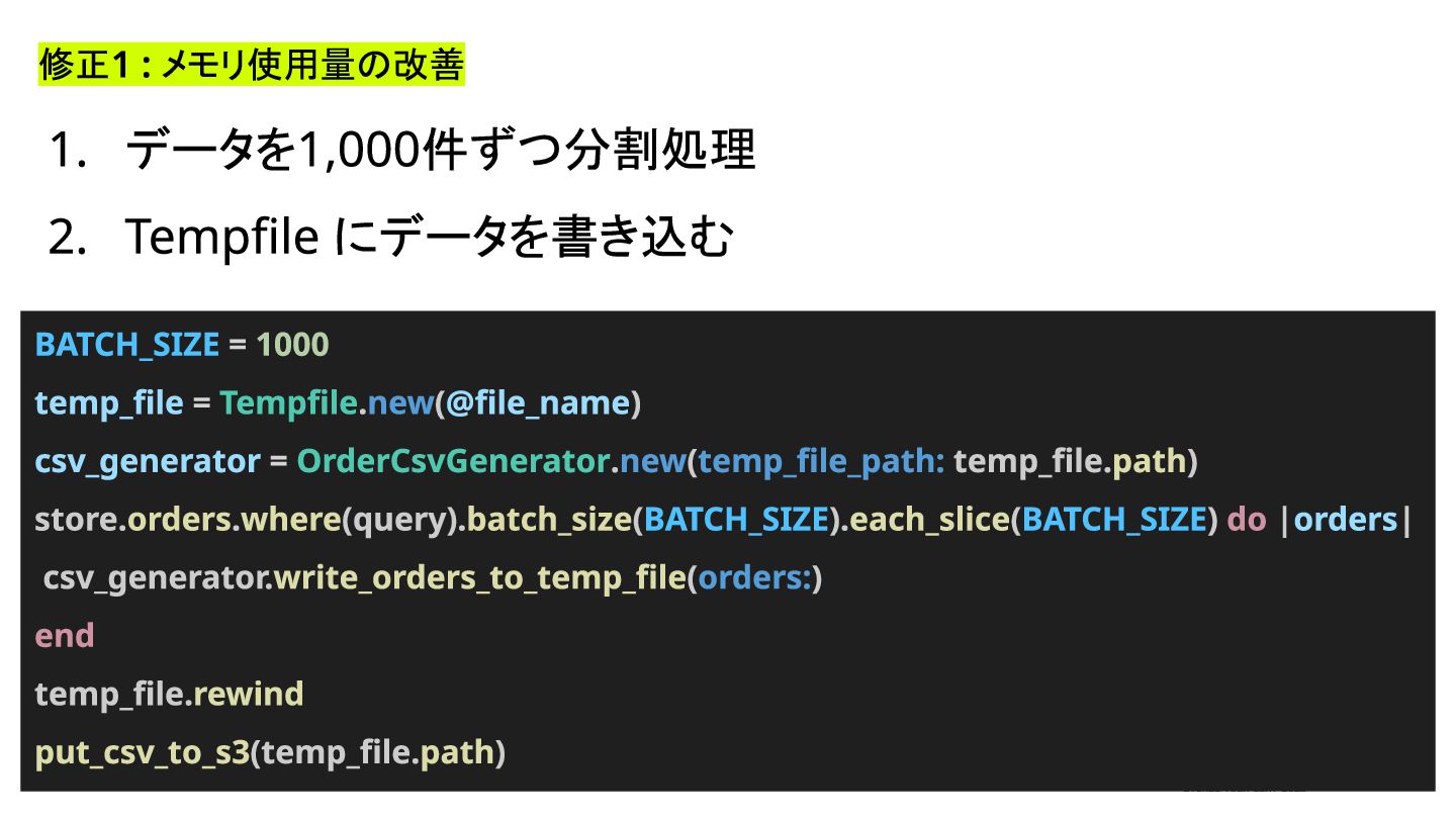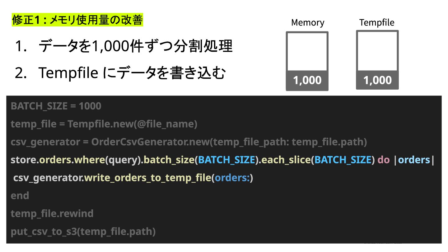 この障害に対し、データ分割処理やTempfileでメモリ効率を改善するとともに、Sidekiqのリトライ処理や失敗通知を実装しました。さらに本番同等のデータで徹底検証を行い、別のあるあるエラーも乗り越えて、機能の安定稼働を実現しました。この経験を活かして、次の類似機能は迅速に障害無くリリースできました。