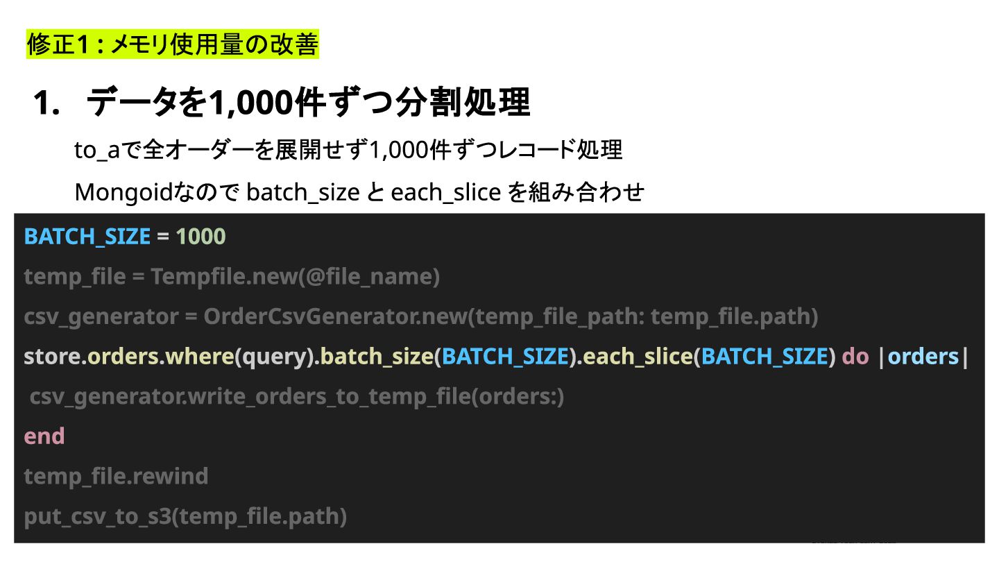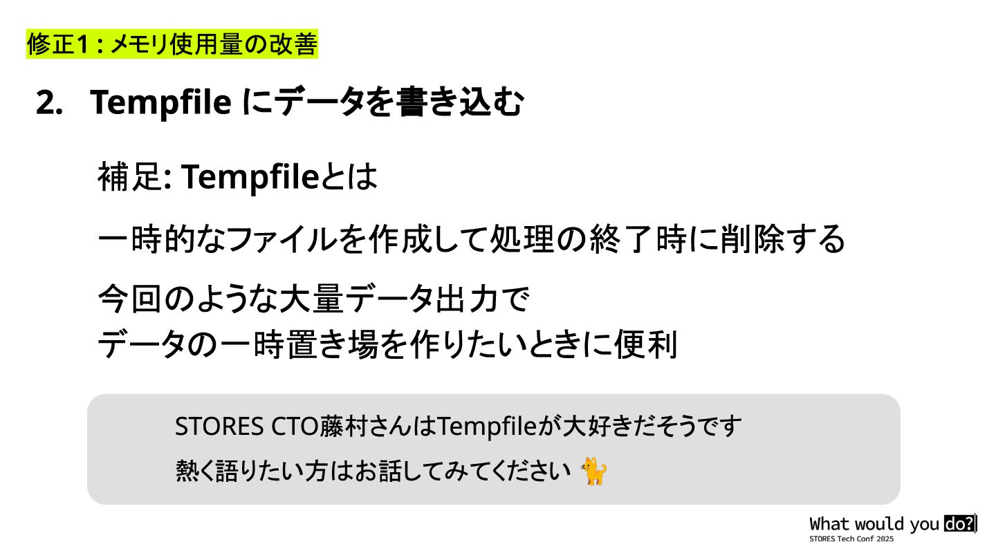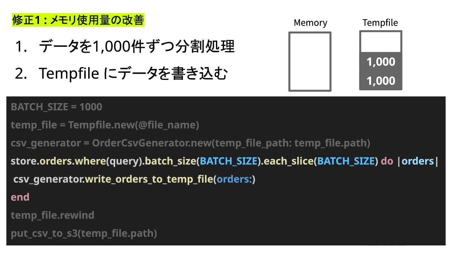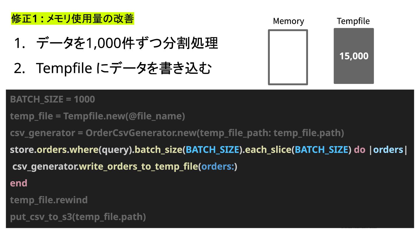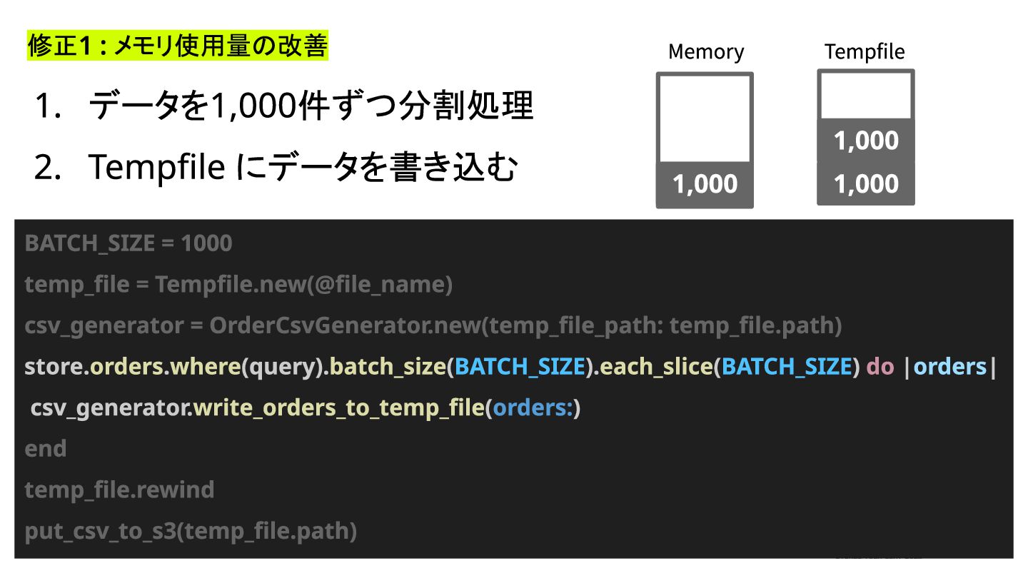 この障害に対し、データ分割処理やTempfileでメモリ効率を改善するとともに、Sidekiqのリトライ処理や失敗通知を実装しました。さらに本番同等のデータで徹底検証を行い、別のあるあるエラーも乗り越えて、機能の安定稼働を実現しました。この経験を活かして、次の類似機能は迅速に障害無くリリースできました。