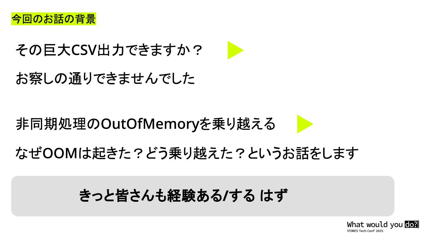 非同期処理のOutOfMemoryを乗り越えた経験から、データ規模を意識した開発の重要性と実践方法をお話します。