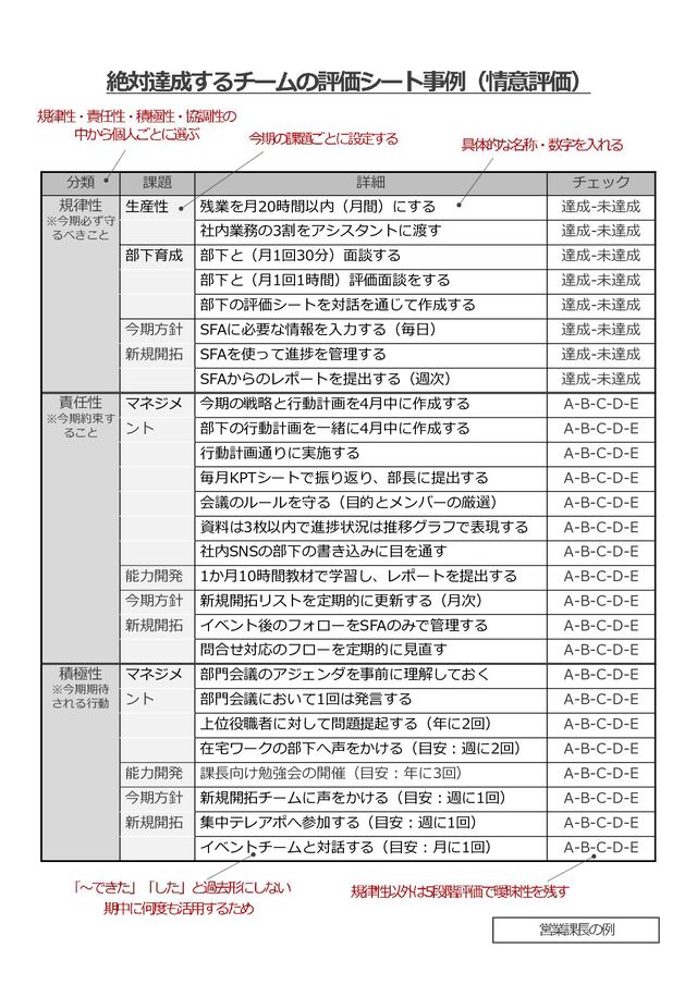 社内業務の3割をアシスタントに渡す 達成-未達成 部下育成 部下と(月1回30分)面談する 達成-未達成 部下と(月1回1時間)評価面談をする 達成-未達成 部下の評価シートを対話を通じて作成する 達成-未達成 今期方針 SFAに必要な情報を⼊⼒する(毎⽇) 達成-未達成 新規開拓 SFAを使って進捗を管理する 達成-未達成 SFAからのレポートを提出する(週次) 達成-未達成 責任性 ※今期約束す ること マネジメ 今期の戦略と⾏動計画を4月中に作成する A-B-C-D-E ント 部下の⾏動計画を⼀緒に4月中に作成する A-B-C-D-E ⾏動計画通りに実施する A-B-C-D-E 毎月KPTシートで振り返り、部⻑に提出する A-B-C-D-E 会議のルールを守る(目的とメンバーの厳選) A-B-C-D-E 資料は3枚以内で進捗状況は推移グラフで表現する A-B-C-D-E 社内SNSの部下の書き込みに目を通す A-B-C-D-E 能⼒開発 1か月10時間教材で学習し、レポートを提出する A-B-C-D-E 今期方針 新規開拓リストを定期的に更新する(月次) A-B-C-D-E 新規開拓 イベント後のフォローをSFAのみで管理する A-B-C-D-E 問合せ対応のフローを定期的に⾒直す A-B-C-D-E 積極性 ※今期期待 される⾏動 マネジメ 部門会議のアジェンダを事前に理解しておく A-B-C-D-E ント 部門会議において1回は発言する A-B-C-D-E 上位役職者に対して問題提起する(年に2回) A-B-C-D-E 在宅ワークの部下へ声をかける(目安︓週に2回) A-B-C-D-E 能⼒開発 課⻑向け勉強会の開催(目安︓年に3回) A-B-C-D-E 今期方針 新規開拓チームに声をかける(目安︓週に1回) A-B-C-D-E 新規開拓 集中テレアポへ参加する(目安︓週に1回) A-B-C-D-E イベントチームと対話する(目安︓月に1回) A-B-C-D-E