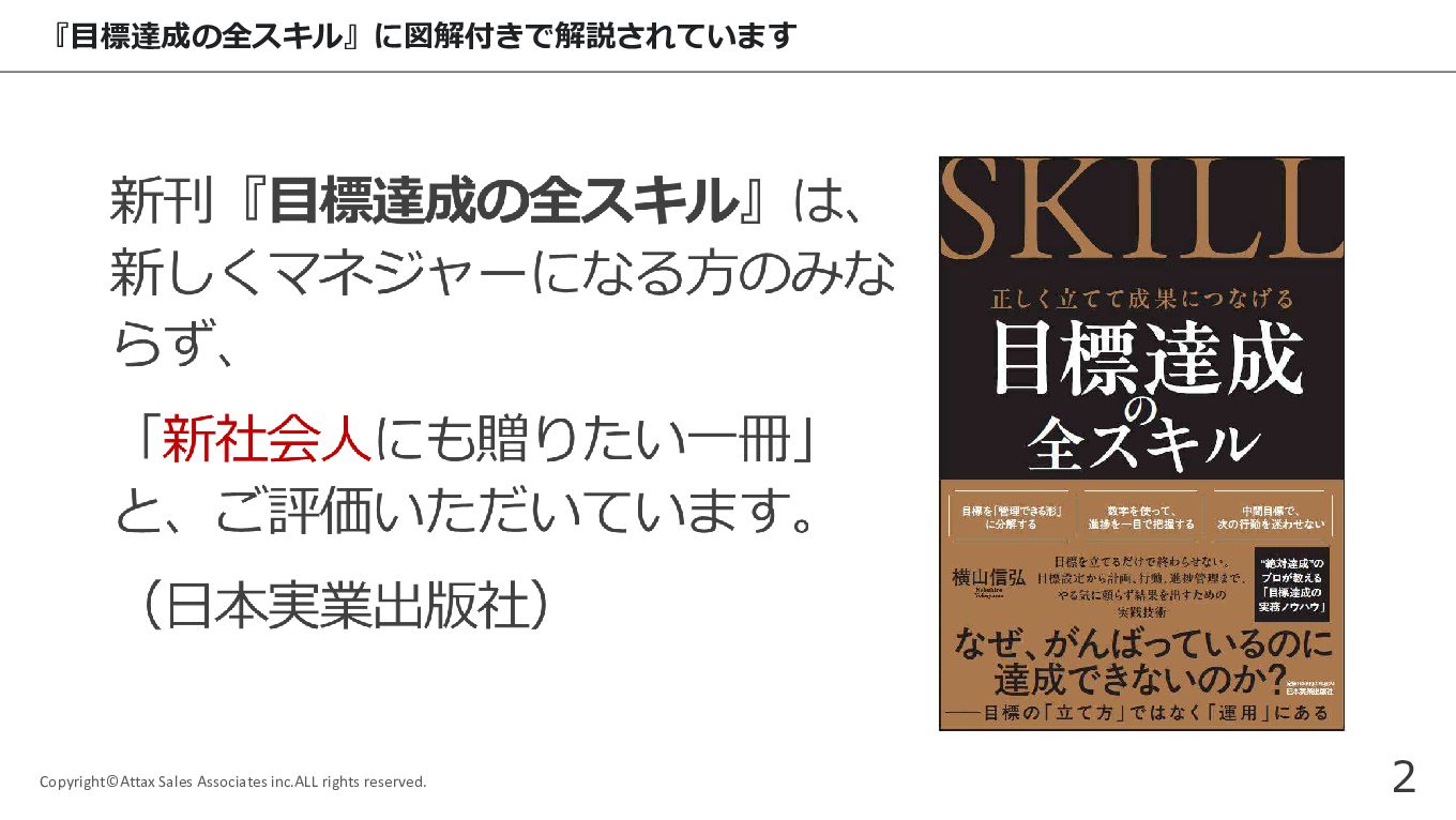 Copyright©Attax Sales Associates inc.ALL rights reserved. 2 『目標達成の全スキル』に図解付きで解説されています