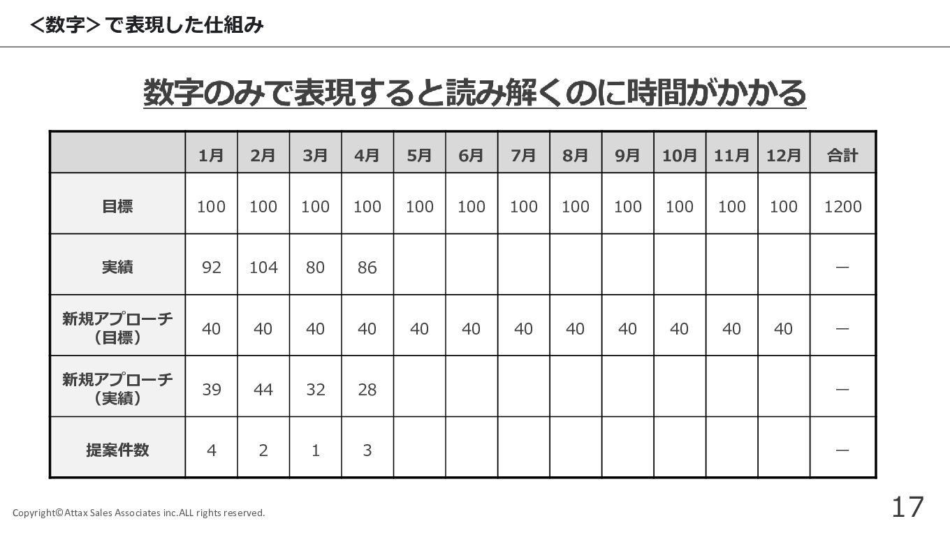 <数字>で表現した仕組み Copyright©Attax Sales Associates inc.ALL rights reserved. 17 合計 12⽉