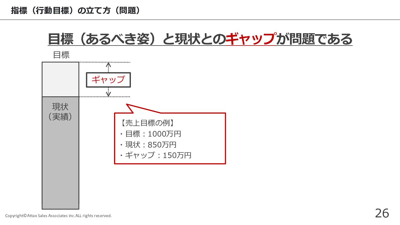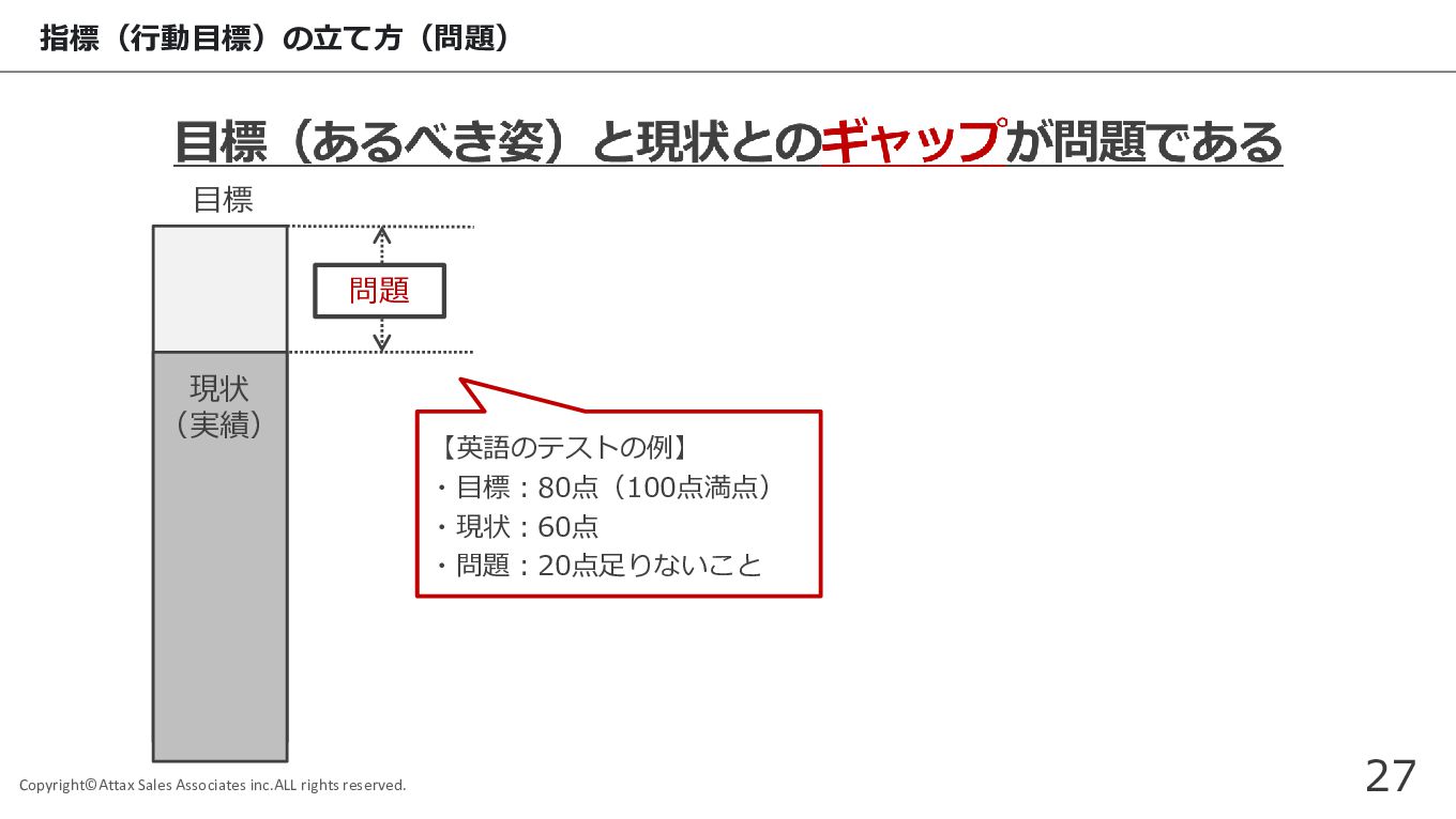 指標(⾏動目標)の⽴て⽅(問題) Copyright©Attax Sales Associates inc.ALL rights reserved. 26 ギャップ 目標