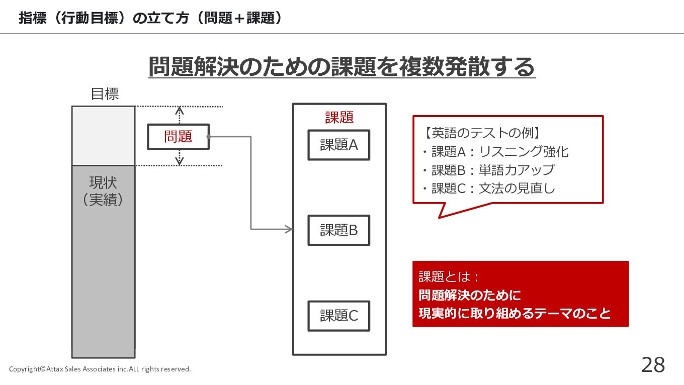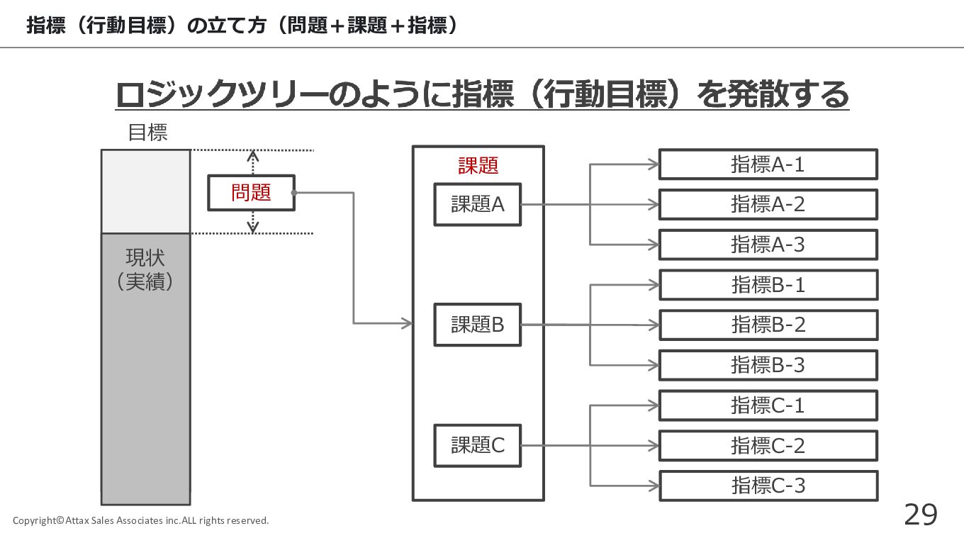 課題 指標(⾏動目標)の⽴て⽅(問題+課題) Copyright©Attax Sales Associates inc.ALL rights reserved. 28 問題