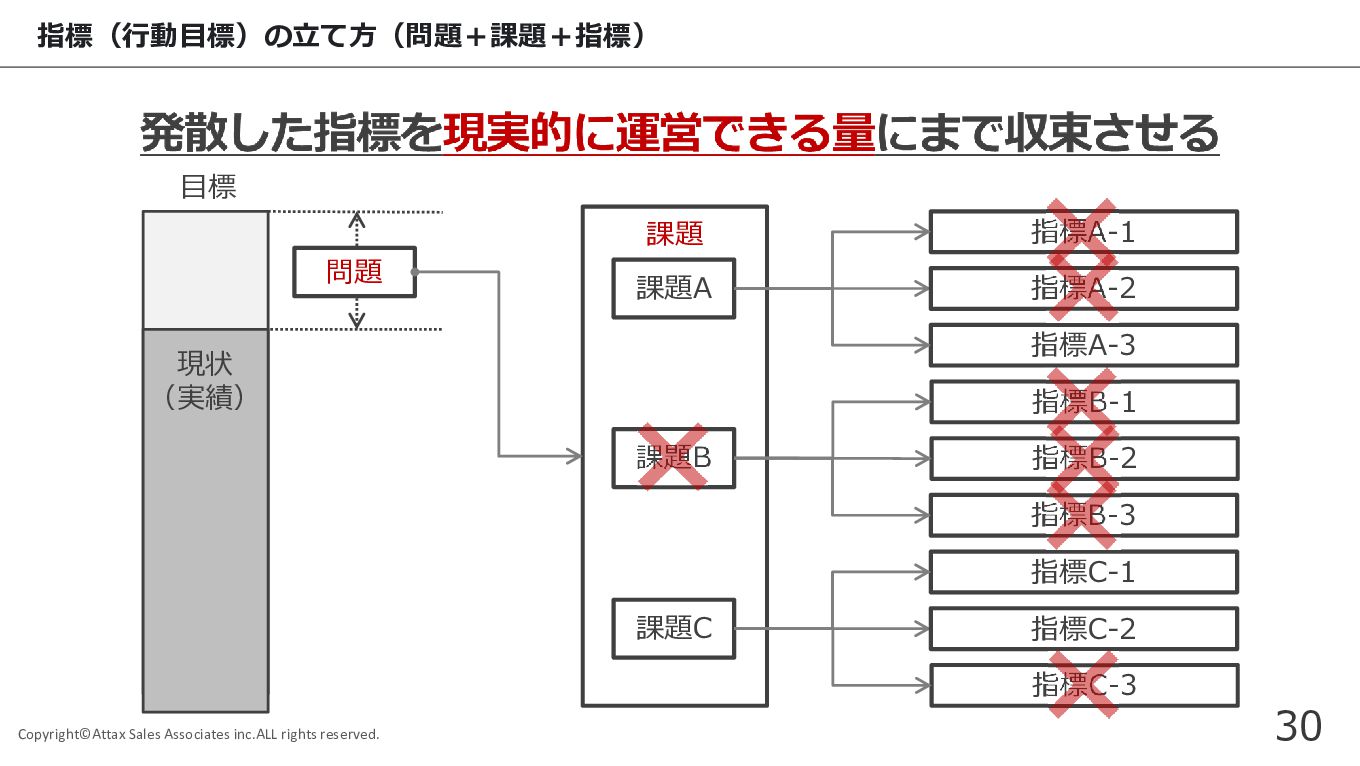 課題 指標(⾏動目標)の⽴て⽅(問題+課題+指標) Copyright©Attax Sales Associates inc.ALL rights reserved. 29 問題