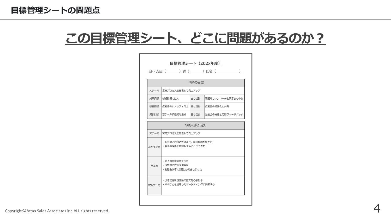 目標管理シートの問題点 Copyright©Attax Sales Associates inc.ALL rights reserved. 4