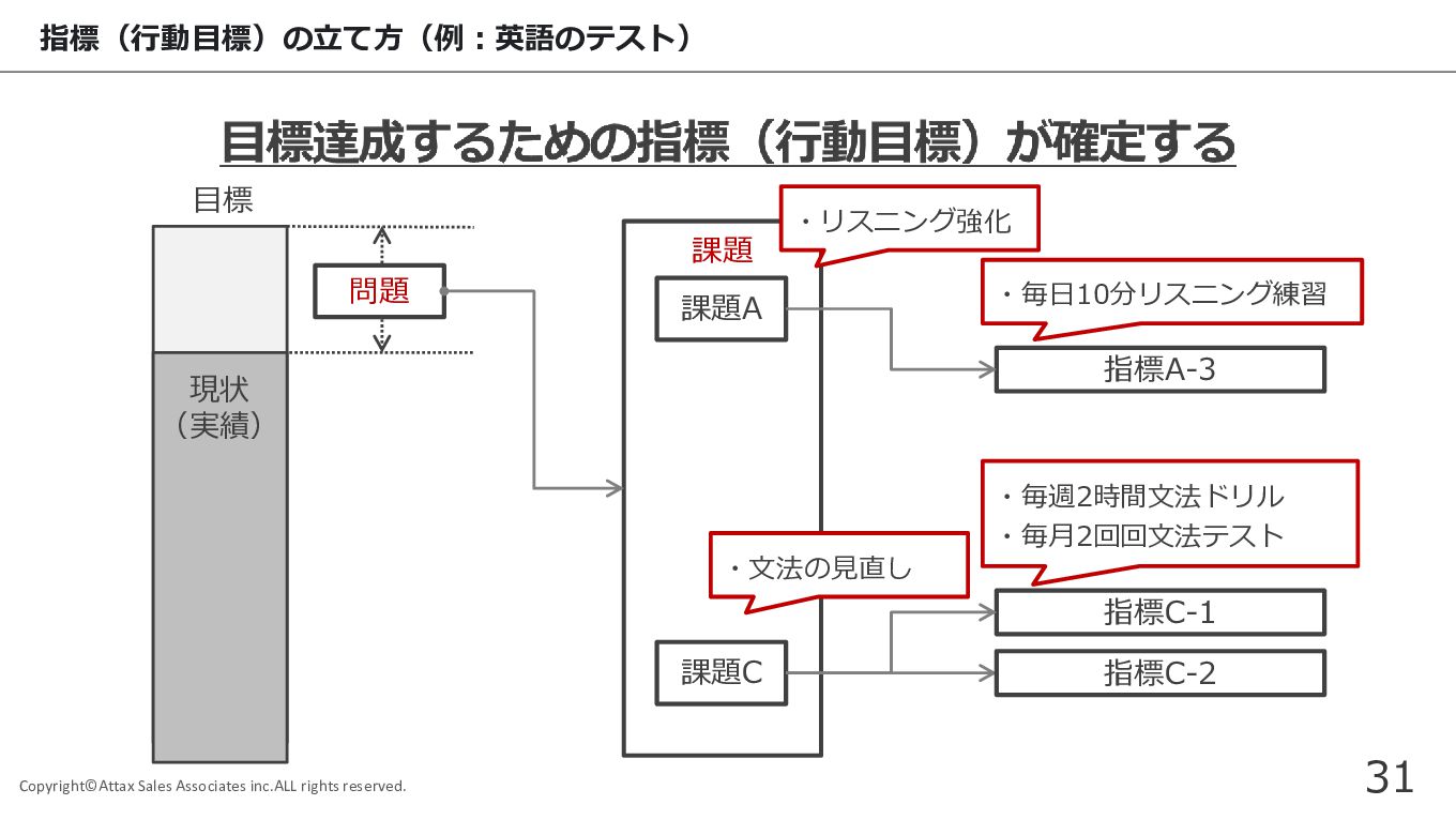 課題 指標(⾏動目標)の⽴て⽅(例︓英語のテスト) Copyright©Attax Sales Associates inc.ALL rights reserved. 31 問題